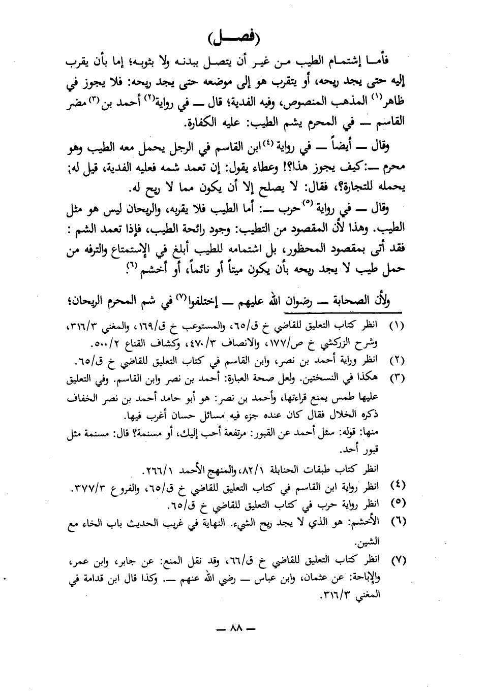 فَأَمَّا اشْتِمَامُ الطِّيبِ مِنْ غَيْرِ أَنْ يَتَّصِلَ بِبَدَنِهِ وَلَا بِثَوْبِهِ؛ إِمَّا بِأَنْ يَقْرُبَ إِلَيْهِ حَتَّى يَجِدَ رِيحَهُ، أَوْ يَتَقَرَّبَ هُوَ إِلَى مَوْضِعِهِ حَتَّى يَجِدَ رِيحَهُ، فَلَا يَجُوزُ فِي ظَاهِرِ الْمَذْهَبِ الْمَنْصُوصِ، وَفِيهِ الْفِدْيَةُ، قَالَ - فِي رِوَايَةِ أَحْمَدَ بْنِ مُضَرَ الْقَاسِمِ - فِي الْمُحْرِمِ يَشُمُّ الطِّيبَ عَلَيْهِ الْكَفَّارَةُ.