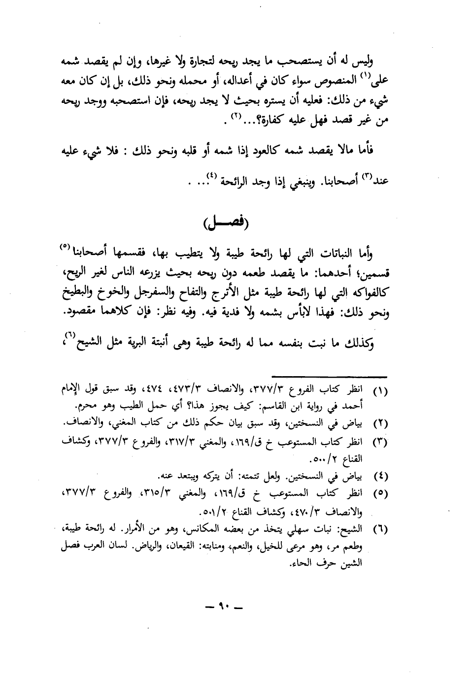 وَأَمَّا النَّبَاتَاتُ الَّتِي لَهَا رَائِحَةٌ طَيِّبَةٌ وَلَا يُتَطَيَّبُ بِهَا فَقَسَمَهَا أَصْحَابُنَا قِسْمَيْنِ؛ أَحَدُهُمَا: مَا يُقْصَدُ طَعْمُهُ دُونَ رِيحِهِ بِحَيْثُ يَزْرَعُهُ النَّاسُ لِغَيْرِ الرِّيحِ، كَالْفَوَاكِهِ الَّتِي لَهَا رَائِحَةٌ طَيِّبَةٌ مِثْلُ الْأُتْرُجِّ، وَالتُّفَّاحِ، وَالسَّفَرْجَلِ، وَالْخَوْخِ، وَالْبِطِّيخِ وَنَحْوِ ذَلِكَ فَهَذَا لَا بَأْسَ بِشَمِّهِ وَلَا فِدْيَةَ فِيهِ. وَفِيهِ نَظَرٌ: فَإِنَّ كِلَاهُمَا مَقْصُودٌ.