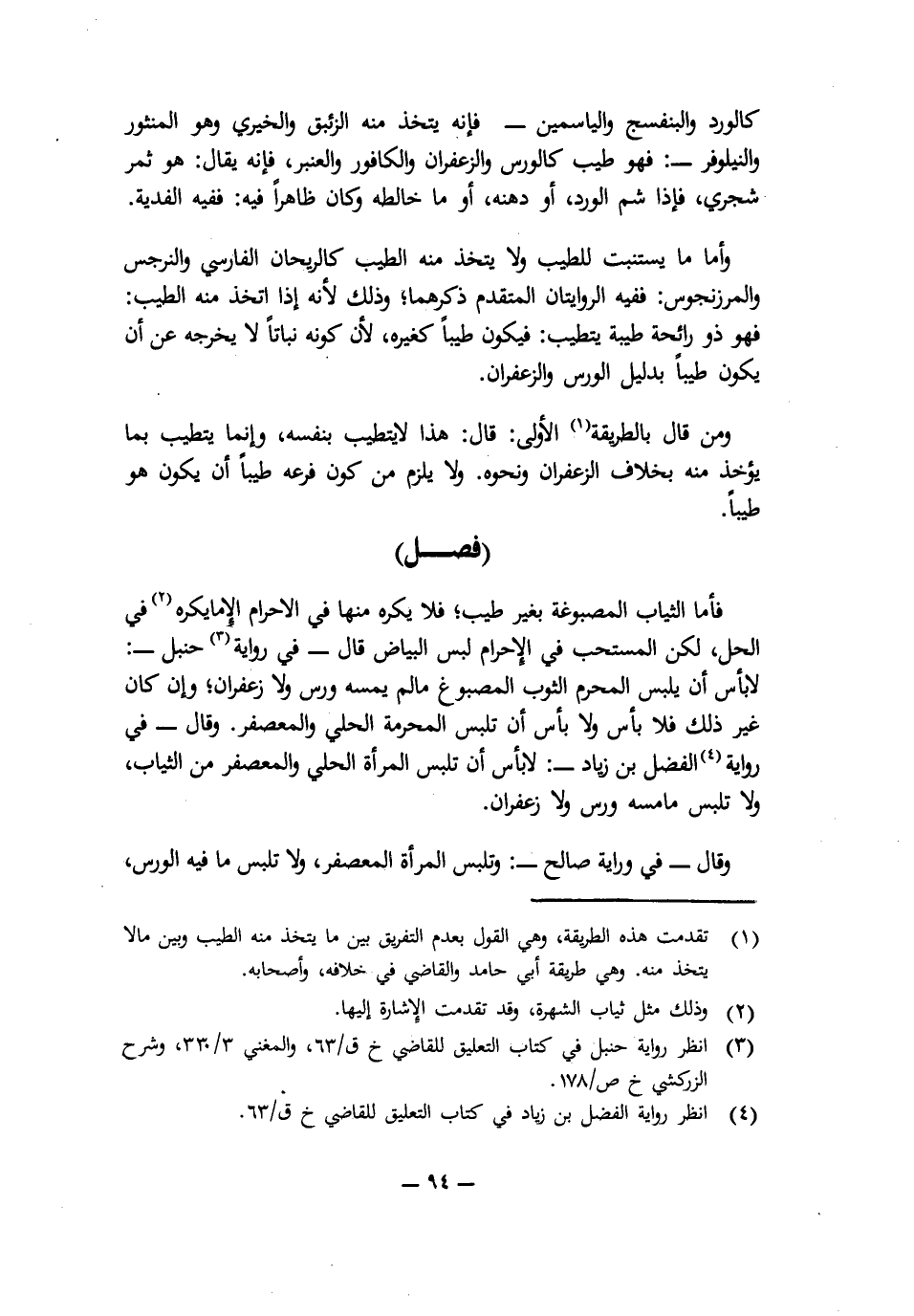 وَأَمَّا مَا يُسْتَنْبَتُ لِلطِّيبِ وَلَا يُتَّخَذُ مِنْهُ الطِّيبُ كَالرَّيْحَانِ الْفَارِسِيِّ وَالنَّرْجِسِ وَالْمَرْزِنْجُوسِ: فَفِيهِ الرِّوَايَتَانِ الْمُتَقَدِّمُ ذِكْرُهُمَا؛ وَذَلِكَ لِأَنَّهُ إِذَا اتَّخَذَ مِنْهُ الطِّيبَ: فَهُوَ ذُو رَائِحَةٍ طَيِّبَةٍ يُتَطَيَّبُ: فَيَكُونُ طِيبًا كَغَيْرِهِ؛ لِأَنَّ كَوْنَهُ نَبَاتًا لَا يُخْرِجُهُ عَنْ أَنْ يَكُونَ طِيبًا بِدَلِيلِ الْوَرْسِ وَالزَّعْفَرَانِ.