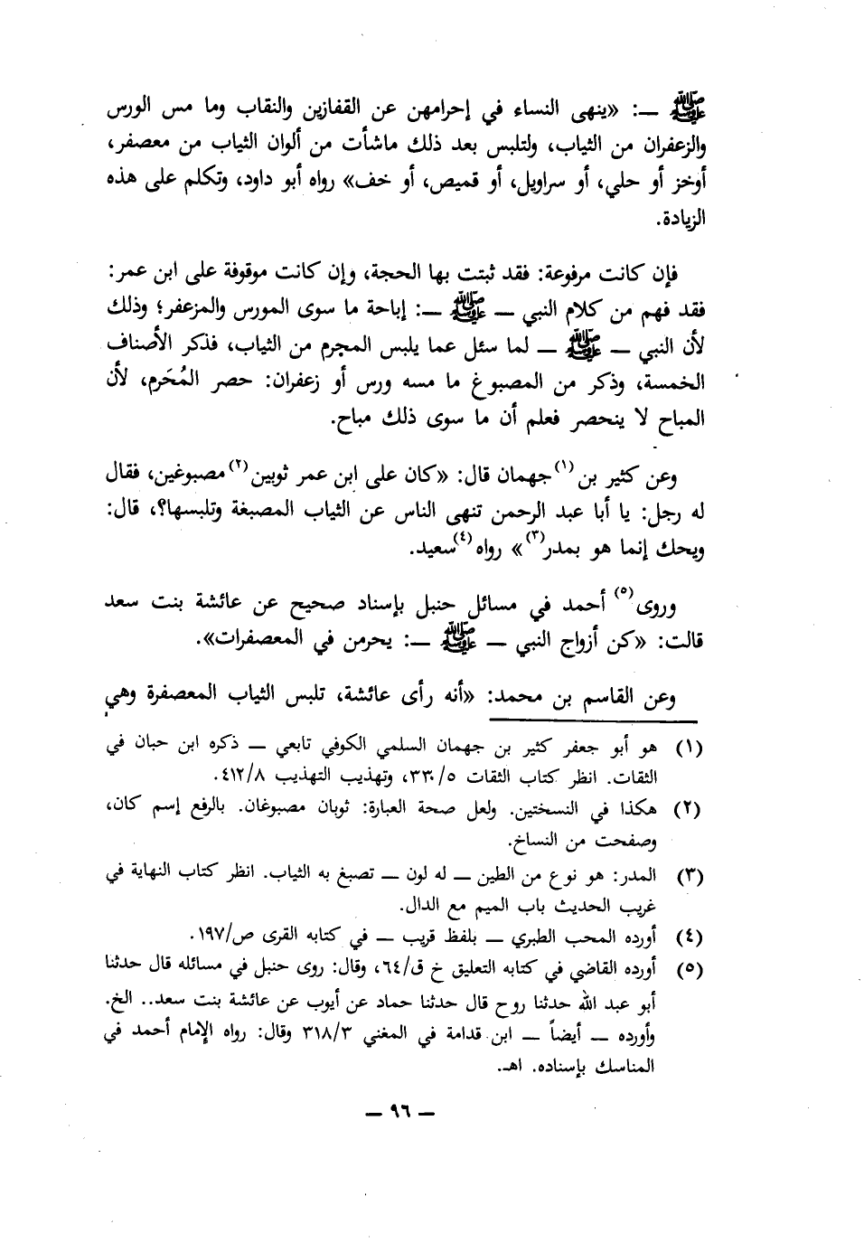 وَرَوَى أَحْمَدُ فِي مَسَائِلِ حَنْبَلٍ بِإِسْنَادٍ صَحِيحٍ عَنْ عَائِشَةَ بِنْتِ سَعْدٍ قَالَتْ: "كُنَّ أَزْوَاجُ النَّبِيِّ - صَلَّى اللَّهُ عَلَيْهِ وَسَلَّمَ - يُحْرِمْنَ فِي الْمُعَصْفَرَاتِ ".