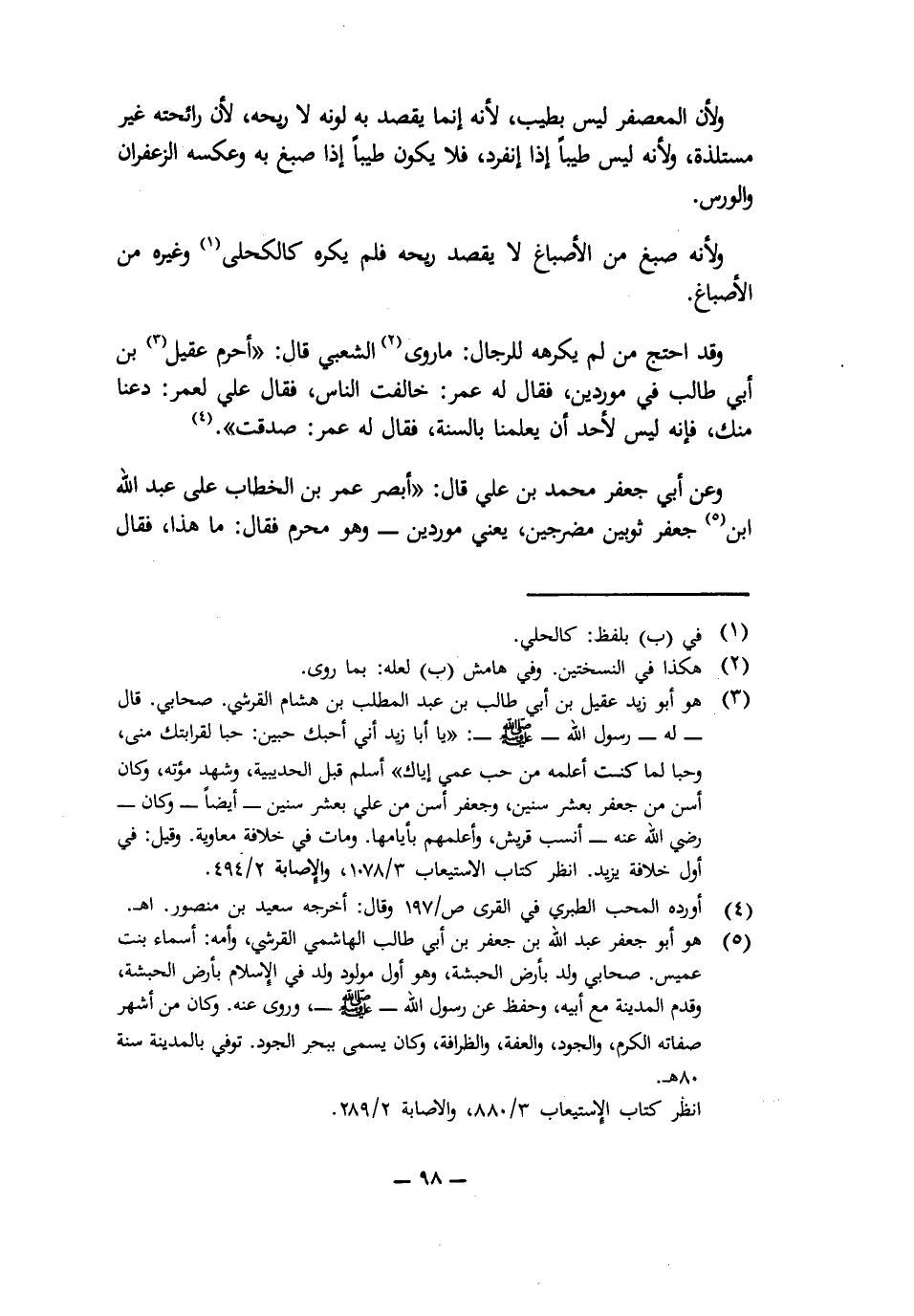 وَعَنْ أَبِي جَعْفَرٍ مُحَمَّدِ بْنِ عَلِيٍّ قَالَ: " أَبْصَرَ عُمَرُ بْنُ الْخَطَّابِ عَلَى عَبْدِ اللَّهِ بْنِ جَعْفَرٍ ثَوْبَيْنِ مُضَرَّجَيْنِ يَعْنِي مُوَرَّدَيْنِ وَهُوَ مُحْرِمٌ فَقَالَ: مَا هَذَا؟ فَقَالَ