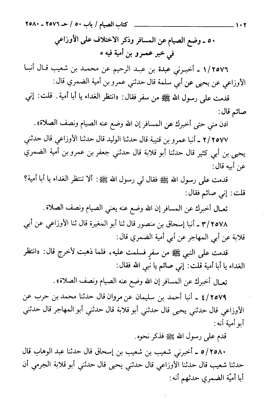 ( 50 وضع الصيام عن المسافر وذكر الاختلاف على الأوزاعي في خبر عمرو بن أمية فيه )