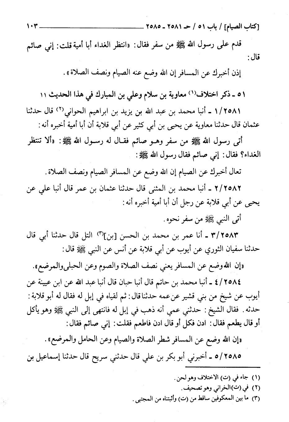 2585 - أخبرني أبو بكر بن علي قال حدثني سريح قال حدثنا إسماعيل بن علية عن أيوب قال حدثني أبو قلابة هذا الحديث ثم قال هل لك في صاحب الحديث فدلني عليه فلقيته فقل حدثني قريب لي يقال له أنس بن مالك : قال أتيت النبي صلى الله عليه و سلم في إبل لجاري أخذت فوافقته وهو يأكل فدعاني إلى طعامه فقلت إني صائم قال ادن أخبرك عن ذلك إن الله وضع عن المسافر الصوم وشطر الصلاة