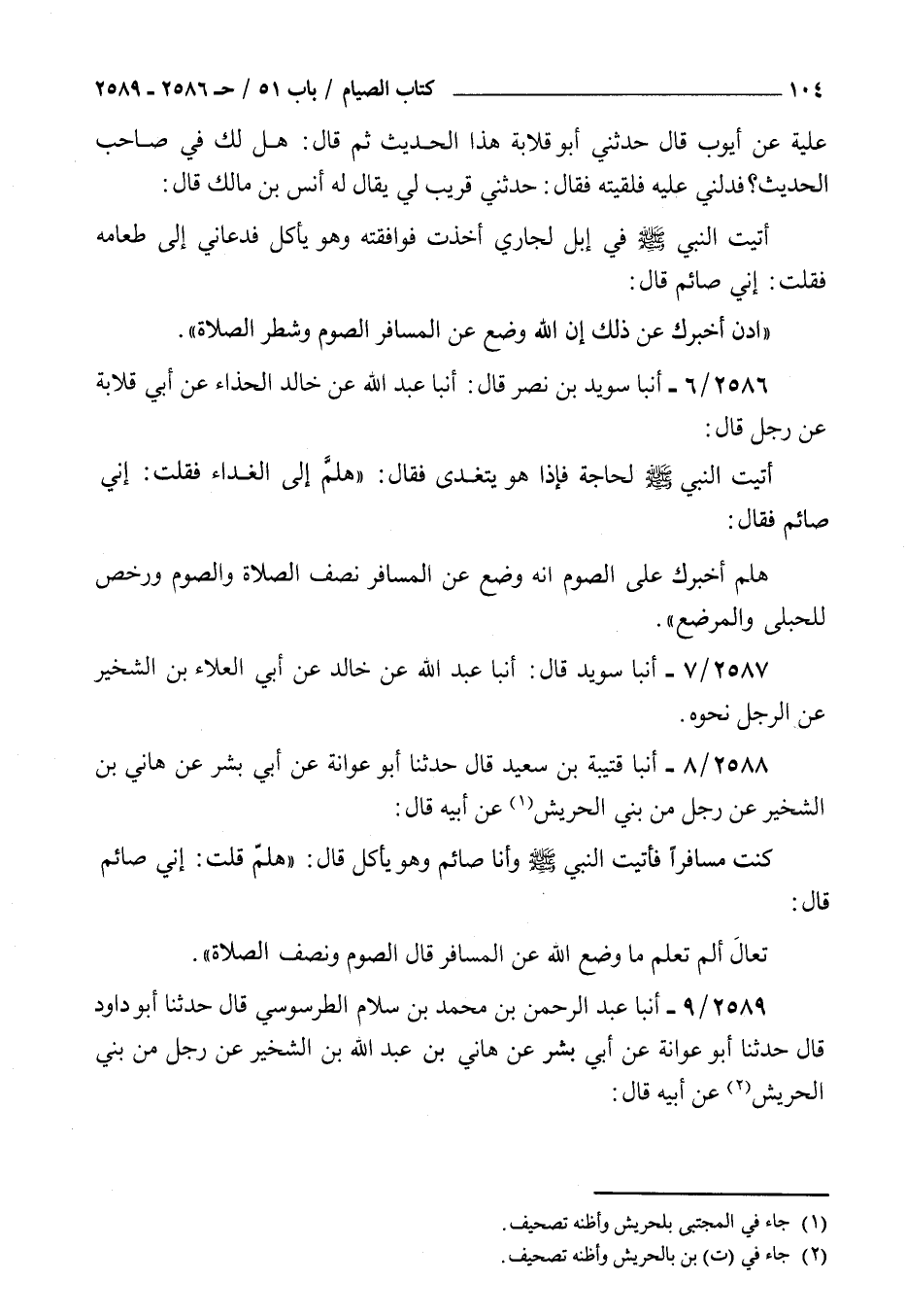 2589 - أنبأ عبد الرحمن بن محمد بن سلام الطرسوسي قال حدثنا أبو داود قال حدثنا أبو عوانة عن أبي بشر عن هاني بن عبد الله بن الشخير عن رجل من بني الحريش عن أبيه قال : كنا نسافر فأتينا رسول الله صلى الله عليه و سلم وهو يطعم فقال هلم فاطعم فقلت إني صائم فقال رسول الله صلى الله عليه و سلم أحدثك عن الصيام إن الله وضع عن المسافر الصوم وشطر الصلاة
