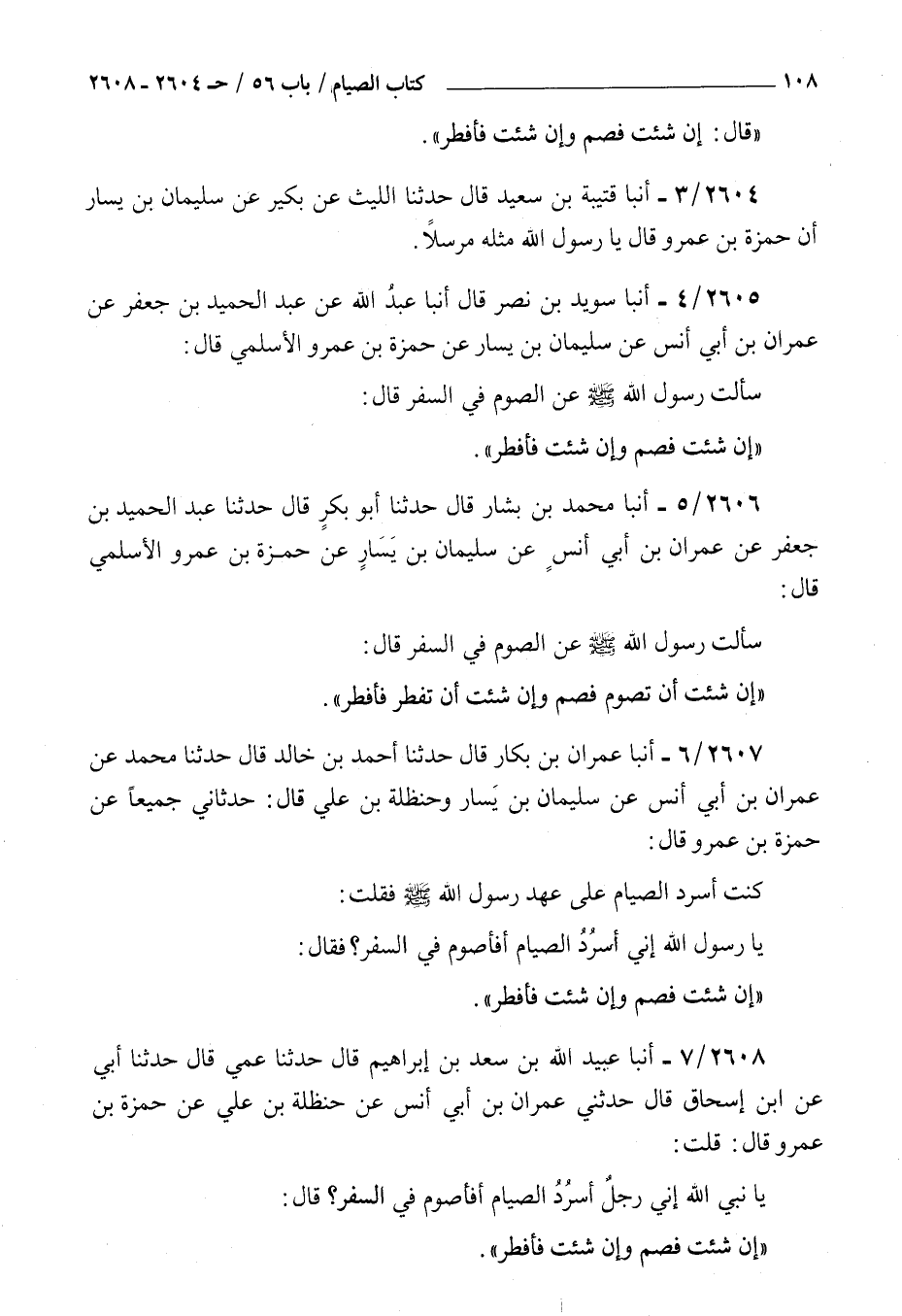 2606 - أنبأ محمد بن بشار قال حدثنا أبو بكر قال حدثنا عبد الحميد بن جعفر عن عمران بن أبي أنس عن سليمان بن يسار عن حمزة بن عمرو الأسلمي قال : سألت رسول الله صلى الله عليه و سلم عن الصوم في السفر قال إن شئت أن تصوم فصم وإن شئت أن تفطر فأفطر