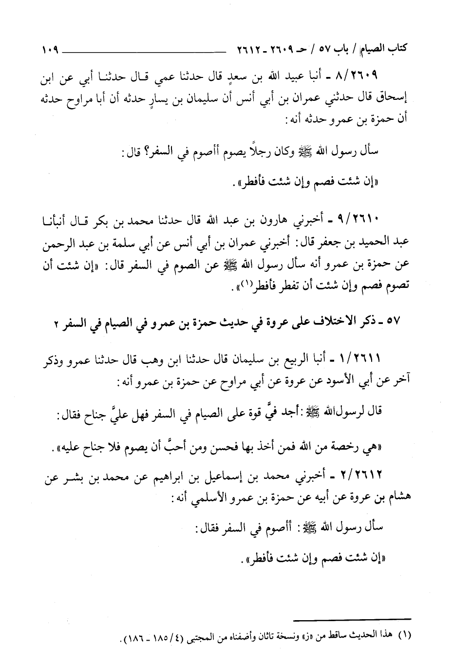 2612 - أخبرني محمد بن إسماعيل بن إبراهيم عن محمد بن بشر عن هشام بن عروة عن أبيه عن حمزة بن عمرو الأسلمي : أنه سأل رسول الله صلى الله عليه و سلم أأصوم في السفر فقال إن شئت فصم وإن شئت فأفطر