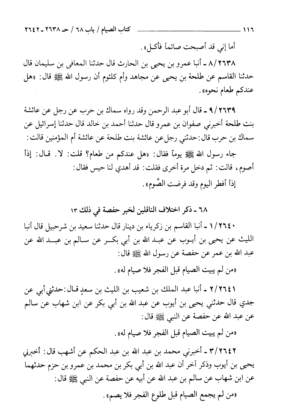 2640 - أنبأ القاسم بن زكريا بن دينار قال حدثنا سعيد بن شرحبيل قال أنبأ الليث عن يحيى بن أيوب عن عبد الله بن أبي بكر عن سالم بن عبد الله عن عبد الله بن عمر عن حفصة عن رسول الله صلى الله عليه و سلم قال : من لم يبيت الصيام قبل الفجر فلا صيام له
