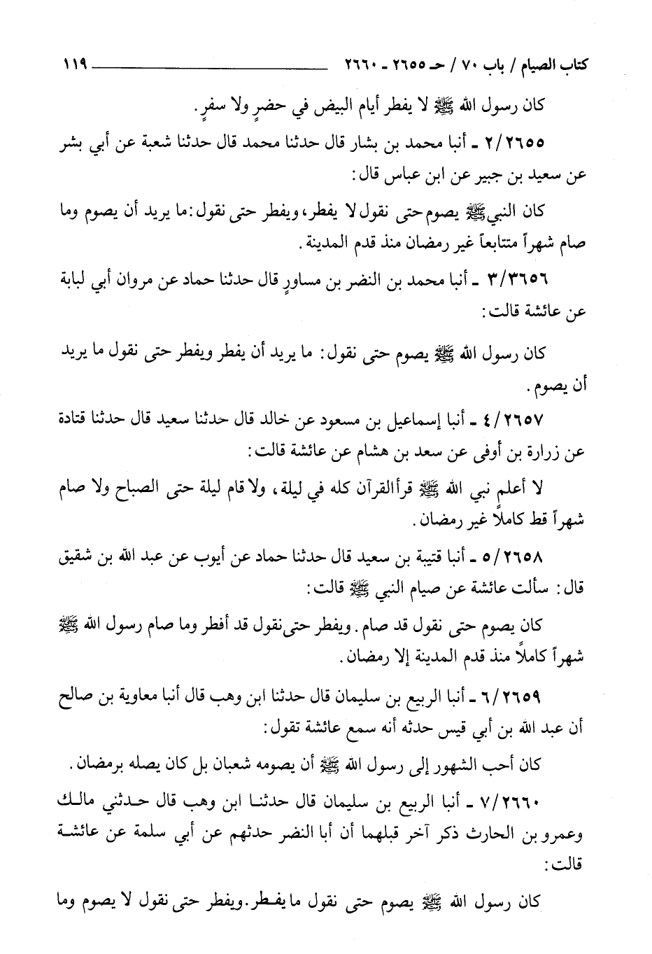 2658 - أنبأ قتيبة بن سعيد قال حدثنا حماد عن أيوب عن عبد الله بن شقيق قال سألت عائشة عن صيام النبي صلى الله عليه و سلم قالت : كان يصوم حتى نقول قد صام ويفطر حتى نقول قد أفطر وما صام رسول الله صلى الله عليه و سلم شهرا كاملا منذ قدم المدينة إلا رمضان