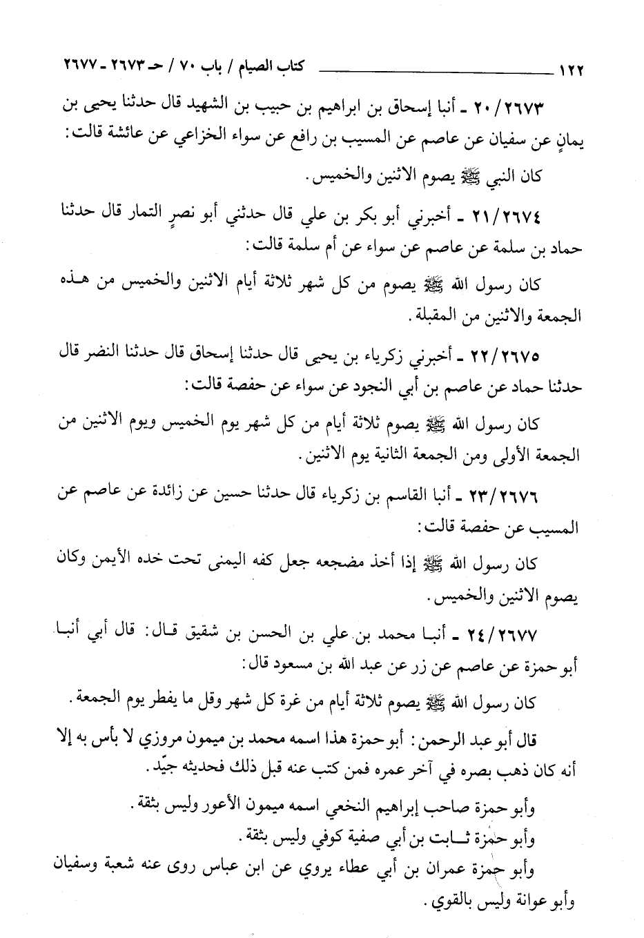 2673 - أنبأ إسحاق بن إبراهيم بن حبيب بن الشهيد قال حدثنا يحيى بن يمان عن سفيان عن عاصم عن المسيب بن رافع عن سواء الخزاعي عن عائشة قالت : كان النبي صلى الله عليه و سلم يصوم الإثنين والخميس