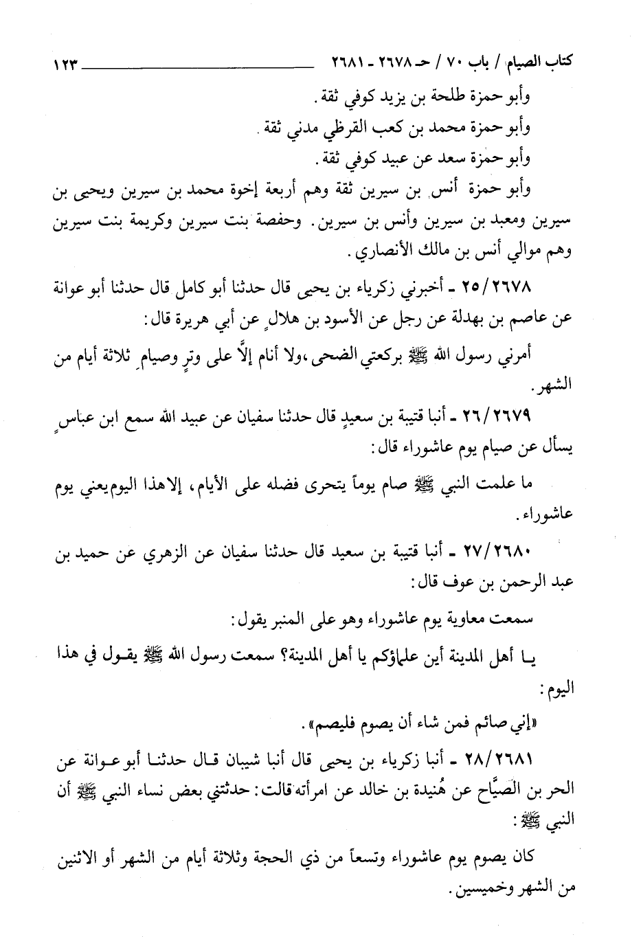 2680 - أنبأ قتيبة بن سعيد قال حدثنا سفيان عن الزهري عن حميد بن عبد الرحمن بن عوف قال سمعت معاوية يوم عاشوراء وهو على المنبر يقول يا أهل المدينة أين علمائكم يا أهل المدينة سمعت رسول الله صلى الله عليه و سلم يقول : في هذا اليوم إني صائم فمن شاء أن يصوم فليصم