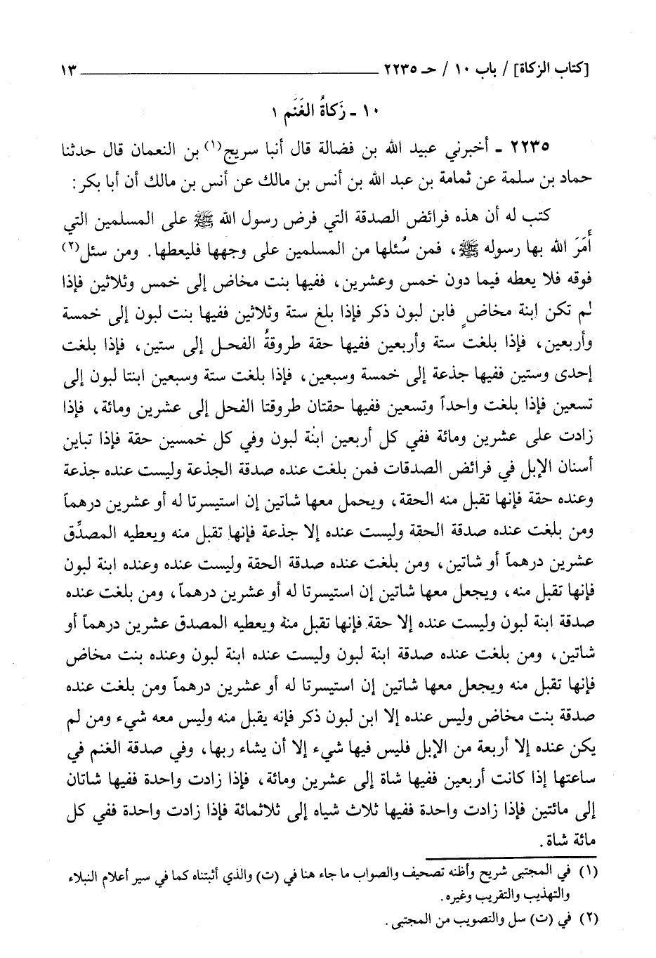 2235 - أخبرني عبد الله بن فضالة قال أنبأ سريج بن النعمان قال حدثنا حماد بن سلمة عن ثمامة بن عبد الله بن أنس بن مالك عن أنس بن مالك : أن أبا بكر كتب له أن هذه فرائض الصدقة التي فرض رسول الله صلى الله عليه و سلم على المسلمين التي أمر بها رسوله صلى الله عليه و سلم فمن سئلها من المسلمين على وجهها فليعطها ومن سئل فوقه فلا يعطه فيما دون خمس وعشرين ففيها بنت مخاض إلى خمس وثلاثين فإذا لم تكن ابنة مخاض فابن لبون ذكر فإذا بلغ ستة وثلاثين ففيها بنت لبون إلى خمسة وأربعين فإذا بلغت ستة وأربعين ففيها حقة طروقة الفحل إلى ستين فإذا بلغت إحدى وستين ففيها جذعة إلى خمسة وسبعين فإذا بلغت ستة وسبعين ابنتا لبون إلى تسعين فإذا بلغت واحدا وتسعين ففيها حقتان طروقتا الفحل إلى عشرين ومائة فإذا زادت على عشرين ومائة ففي كل أربعين ابنة لبون وفي كل خمسين حقة فإذا تباين أسنان الإبل في فرائض الصدقات فمن بلغت عنده صدقة الجذعة وليست عنده جذعة وعنده حقة فإنها تقبل منه الحقة ويحمل معها شاتين إن استيسرتا له أو عشرين درهما ومن بلغت عنده صدقة الحقة وليست عنده إلا جذعة فإنها تقبل منه ويعطيه المصدق عشرين درهما أو شاتين ومن بلغت عنده صدقة الحقة وليست عنده وعنده ابنة لبون فإنها تقبل منه ويجعل معها شاتين إن استيسرتا له أو عشرين درهما ومن بلغت عنده صدقة ابنة لبون وليست عنده إلا حقة فإنها تقبل منه ويعطيه المصدق عشرين درهما أو شاتين ومن بلغت عنده صدقة ابنة لبون وليست عنده ابنة لبون وعنده بنت مخاض فإنها تقبل منه ويجعل معها شاتين إن استيسرتا أو عشرين درهما ومن بلغت عنده صدقة بنت مخاض وليس عنده إلا بن لبون ذكر فإنه يقبل منه وليس معه شيء ومن لم يكن عنده إلا أربعة من الإبل فليس فيها شيء إلا أن يشاء ربها وفي صدقة الغنم في ساعتها إذا كانت أربعين ففيها شاة إلى عشرين ومائة فإذا زادت واحدة ففيها شاتان إلى مائتين فإذا زادت واحدة ففيها ثلاث شياه إلى ثلاثمائة فإذا زادت واحدة ففي كل مائة شاة ولا يؤخذ في الصدقة هرمة ولا ذات عوار ولا تيس الغنم إلا أن يشاء المصدق ولا يجمع بين متفرق ولا يفرق بين مجتمع خشية الصدقة وما كان من خليطين فإنهما يتراجعان بينهما بالسوية وإذا كانت سائمة الرجل ناقصة من أربعين شاة واحدة فليس فيها شيء إلا أن يشاء ربها وفي الرقة ربع العشر فإن لم يكن المال إلا تسعين ومائة فليس فيها إلا أن يشاء ربها