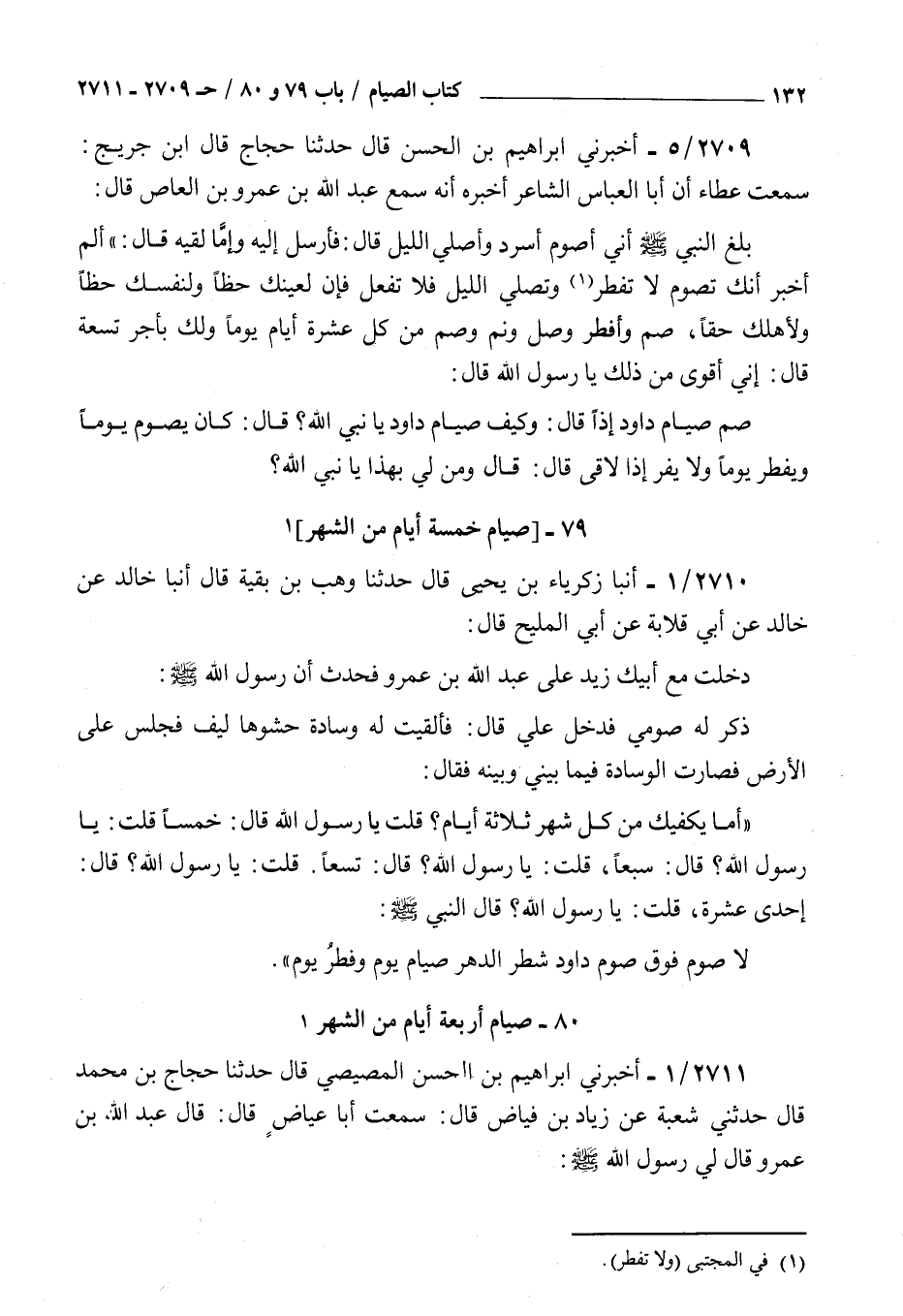 2709 - أخبرني إبراهيم بن الحسن قال حدثنا حجاج قال بن جريج سمعت عطاء أن أبا العباس الشاعر أخبره أنه سمع عبد الله بن عمرو بن العاص قال بلغ النبي صلى الله عليه و سلم إني أصوم أسرد وأصلي الليل قال فأرسل إليه وإما لقيه قال ألم أخبر أنك تصوم لا تفطر وتصلي الليل فلا تفعل فإن لعينك حظا ولنفسك حظا ولأهلك حقا صم وأفطر وصل ونم وصم من كل عشرة أيام يوما ولك بأجر تسعة قال إني أقوى من ذلك يا رسول الله قال صم صيام داود إذا قال وكيف صيام داود يا نبي الله قال : كان يصوم يوما ويفطر يوما ولا يفر إذا لاقى قال قال ومن لي بهذا يا نبي الله