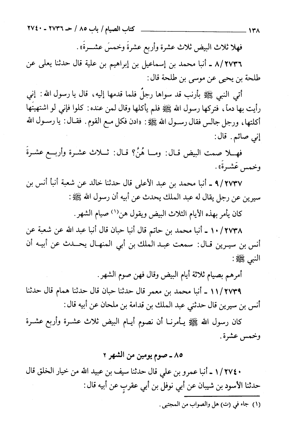2736 - أنبأ محمد بن إسماعيل بن إبراهيم بن علية قال حدثنا يعلى عن طلحة بن يحيى عن موسى بن طلحة قال : أتي النبي صلى الله عليه و سلم بأرنب قد سواها رجل فلما قدمها إليه قال يا رسول الله إني رأيت بها دما فتركها رسول الله صلى الله عليه و سلم فلم يأكلها وقال لمن عنده كلوا فإني لو اشتهيتها أكلتها ورجل جالس فقال رسول الله صلى الله عليه و سلم ادن فكل مع القوم فقال يا رسول الله إني صائم قال فهلا صمت البيض قال وما هن قال ثلاث عشرة وأربع عشرة وخمس عشرة