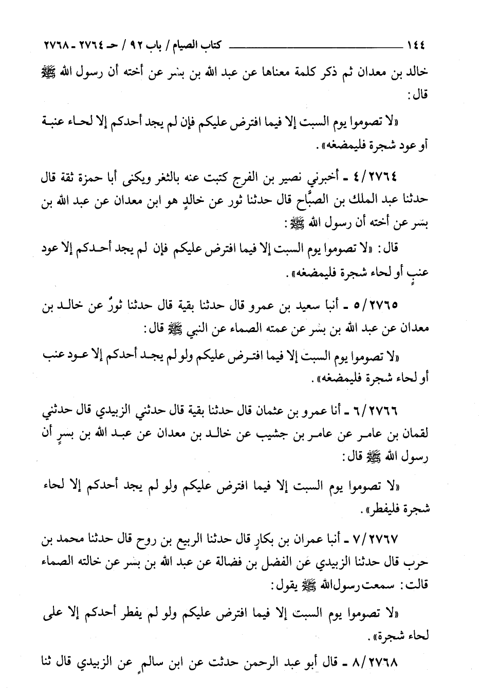 2764 - أخبرني نصير بن الفرج كتبت عنه بالثغر ويكنى أبا حمزة ثقة قال حدثنا عبد الملك بن الصباح قال حدثنا ثور عن خالد وابن معدان عن عبد الله بن بشر عن أخته أن رسول الله صلى الله عليه و سلم قال : لا تصوموا يوم السبت إلا فيما افترض عليكم فإن لم يجد أحدم إلا عود عنب أو لحاء شجرة فليمضغه