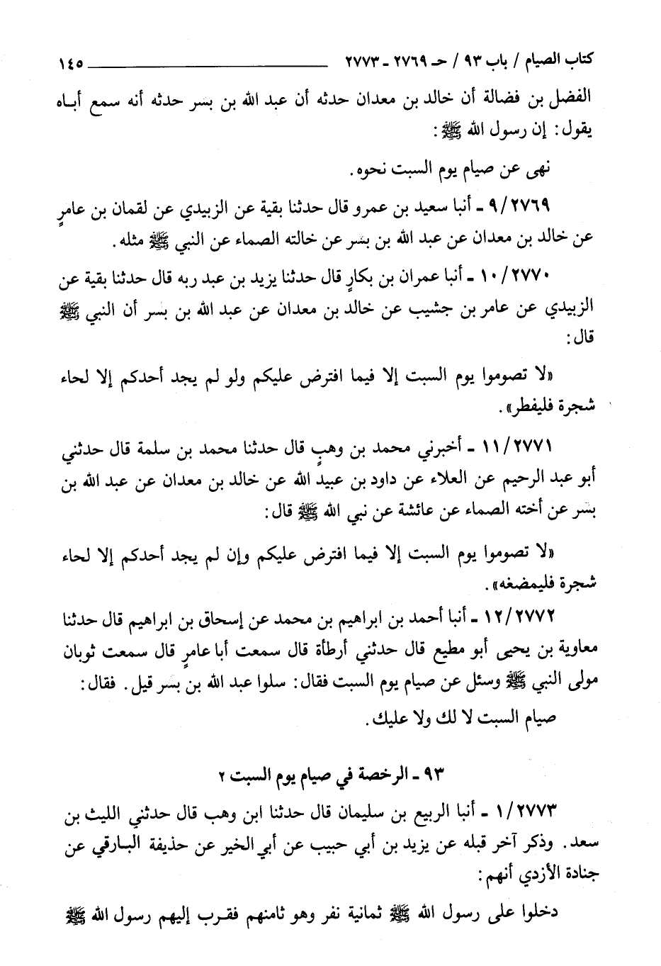 2770 - أنبأ عمران بن بكار قال حدثنا يزيد بن عبد ربه قال حدثنا بقية عن الزبيدي عن عامر بن جشيب عن خالد بن معدان عن عبد الله بن بشر أن النبي صلى الله عليه و سلم قال : لا تصوموا يوم السبت إلا فيما افترض عليكم ولو لم يجد أحدكم إلا لحاء شجرة فليفطر