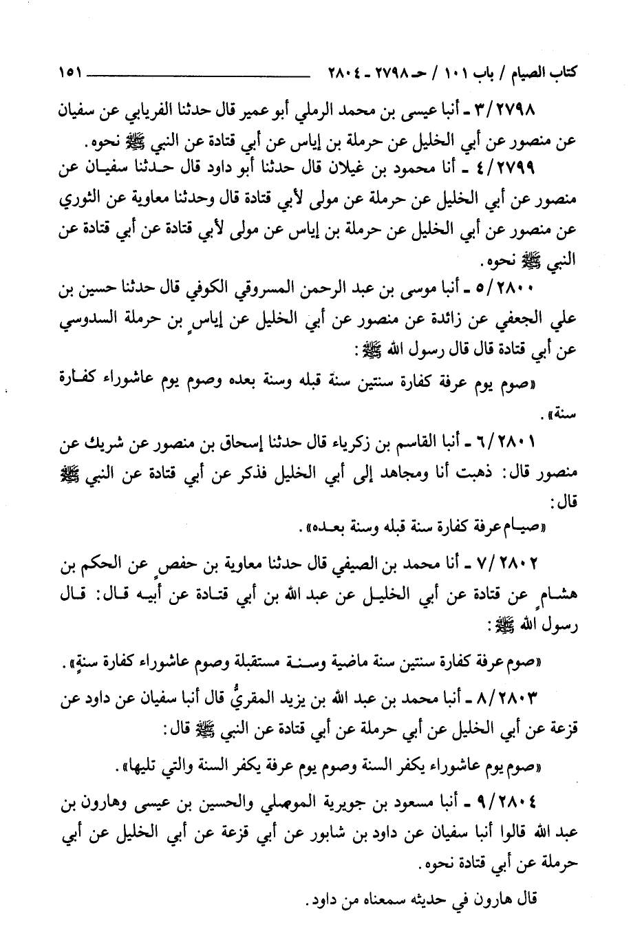 2801 - أنبأ القاسم بن زكريا قال حدثنا إسحاق بن منصور عن شريك عن منصور قال ذهبت أنا ومجاهد إلى أبي الخليل فذكر عن أبي قتادة عن النبي صلى الله عليه و سلم قال : صيام عرفة كفارة سنة قبله وسنة بعده