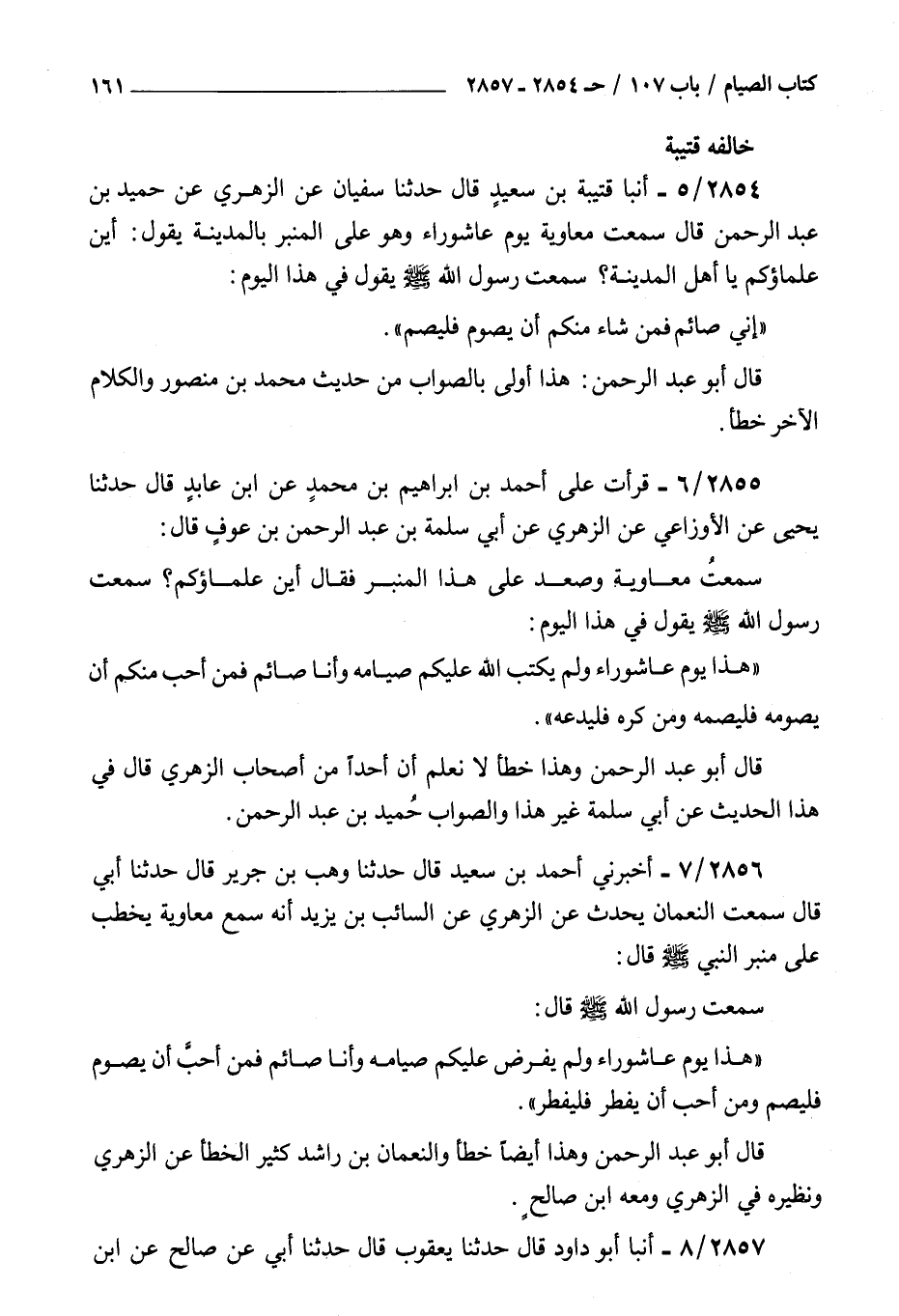 2854 - أنبأ قتيبة بن سعيد قال حدثنا سفيان عن الزهري عن حميد بن عبد الرحمن قال : سمعت معاوية يوم عاشوراء وهو على المنبر بالمدينة يقول أين علماؤكم يا أهل المدينة سمعت رسول الله صلى الله عليه و سلم يقول في هذا اليوم إني صائم فمن شاء منكم أن يصوم فليصم قال أبو عبد الرحمن هذا أولى بالصواب من حديث محمد بن منصور والكلام الآخر خطأ