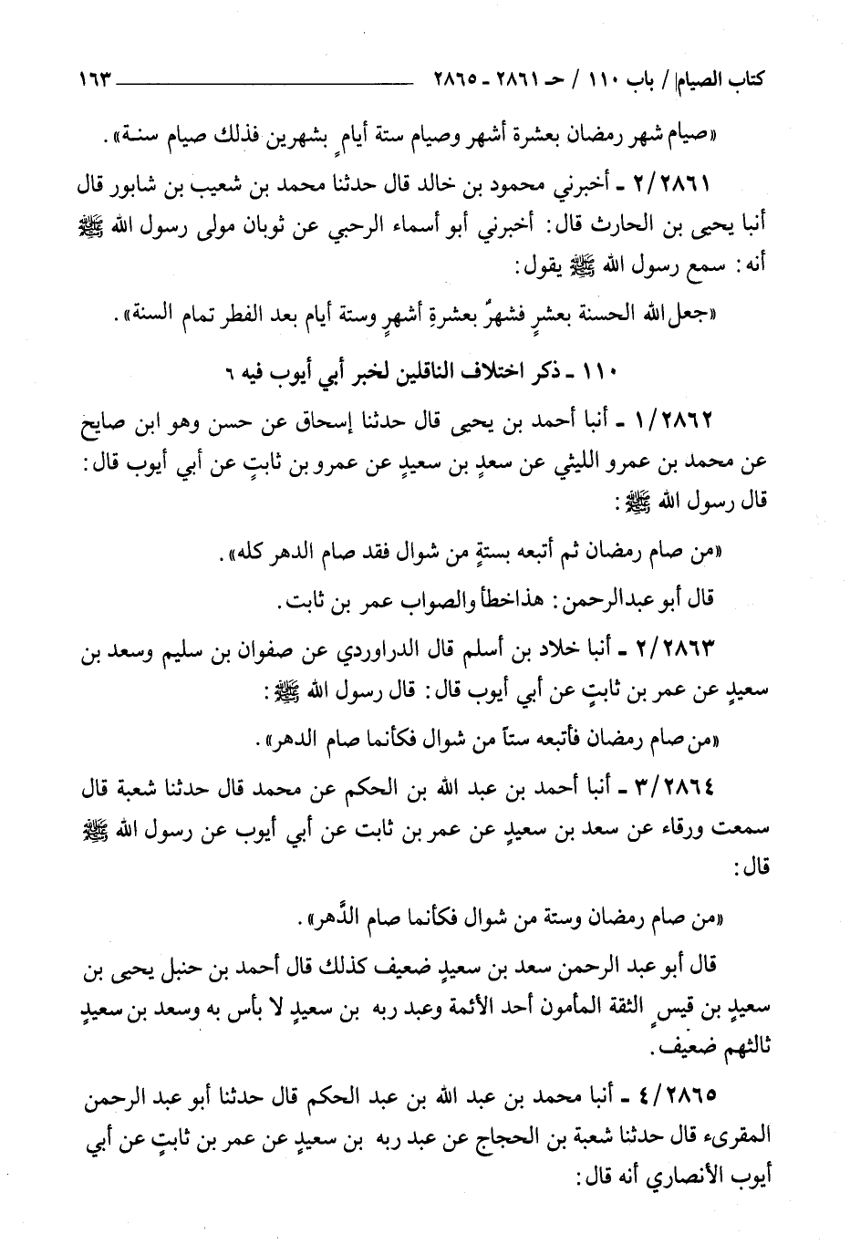 2864 - أنبأ أحمد بن عبد الله بن الحكم عن محمد قال حدثنا شعبة قال سمعت ورقاء عن سعد بن سعيد عن عمر بن ثابت عن أبي أيوب عن رسول الله صلى الله عليه و سلم قال : من صام رمضان وستة من شوال فكأنما صام الدهر قال أبو عبد الرحمن سعد بن سعيد ضعيف كذلك قال أحمد بن حنبل يحيى بن سعيد بن قيس الثقة المأمون أحد الأئمة وعبد ربه بن سعيد لا بأس به وسعد بن سعيد ثالثهم ضعيف
