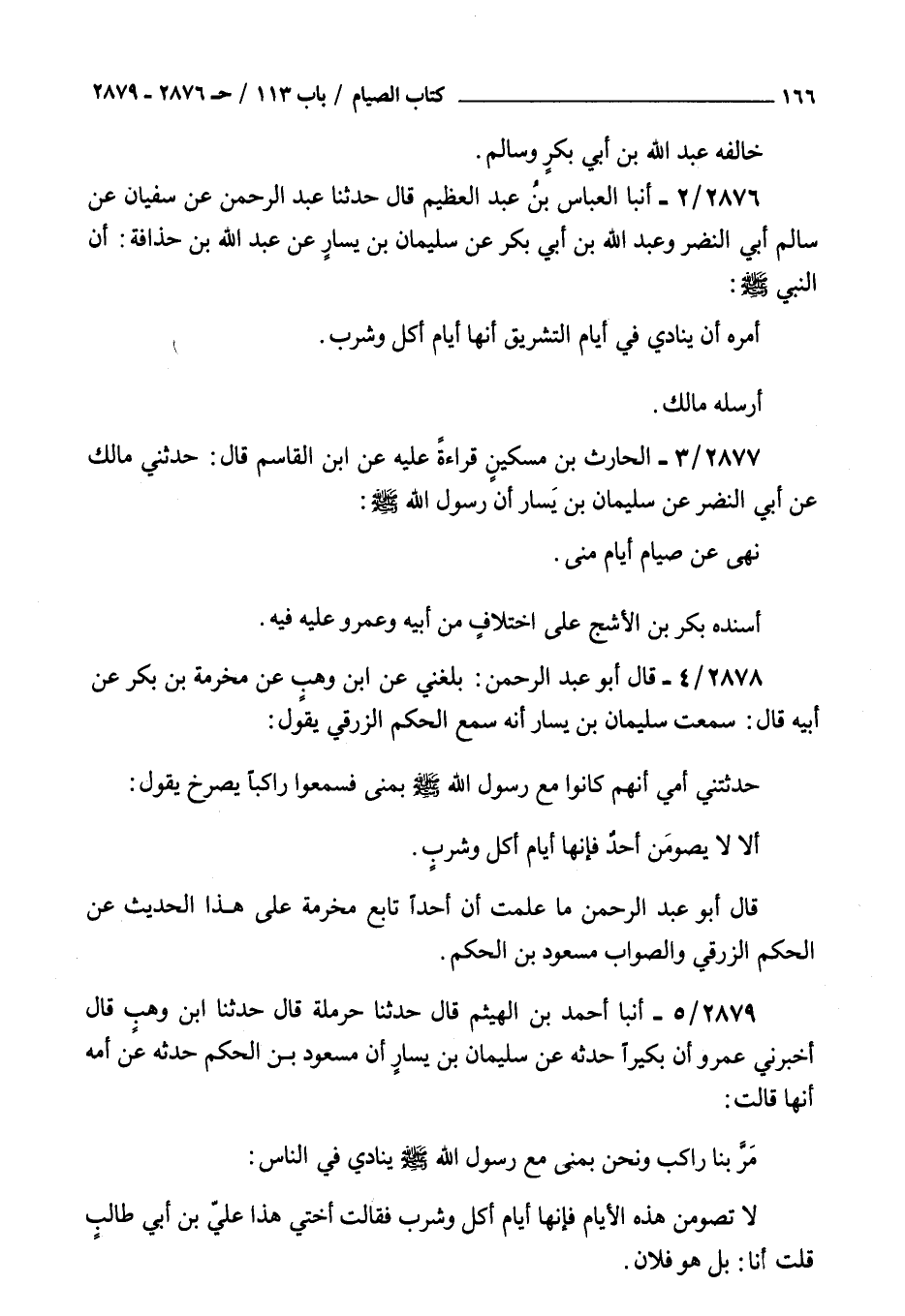 2879 - أنبأ أحمد بن الهيثم قال حدثنا حرملة قال حدثنا بن وهب قال أخبرني عمرو أن بكيرا حدثه عن سليمان بن يسار أن مسعود بن الحكم حدثه عن أمه أنها قالت : مر بنا راكب ونحن بمنى مع رسول الله صلى الله عليه و سلم ينادي في الناس لا تصومن هذه الأيام فإنها أيام أكل وشرب فقالت أختي هذا علي بن أبي طالب قلت أنا بل هو فلان