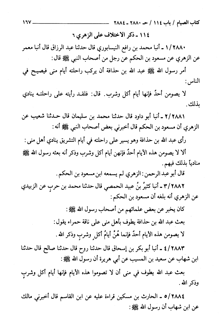 2882 - أنبأ كثير بن عبيد الحمصي قال حدثنا محمد بن حرب عن الزبيدي عن الزهري أنه بلغه أن مسعود بن الحكم كان يخبر عن بعض علمائهم من أصحاب رسول الله صلى الله عليه و سلم : بعث عبد الله بن حذافة يطوف بأهل منى لا يصومن هذه الأيام أحد فإنما هن أيام أكل وشرب وذكر الله