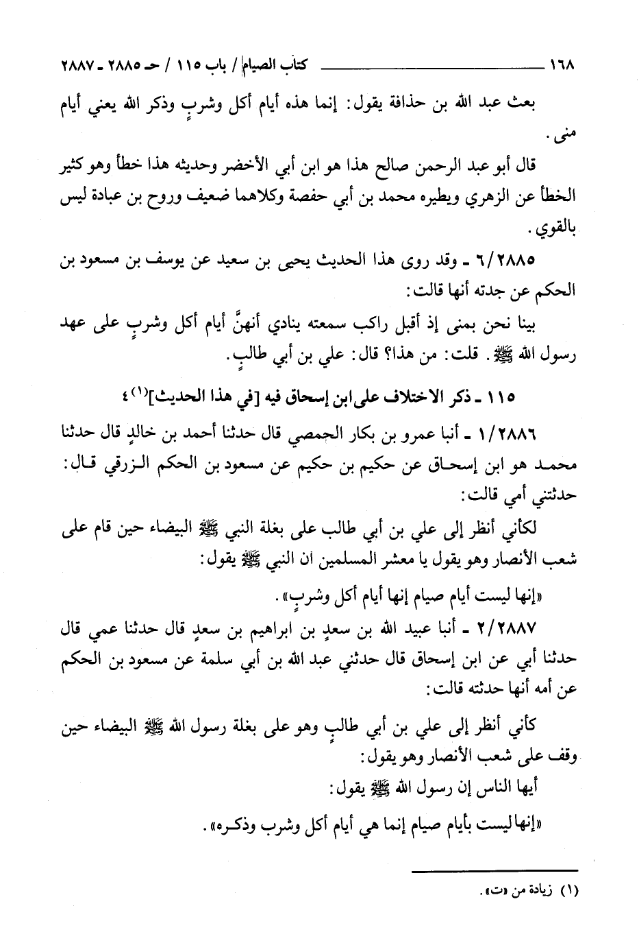 2886 - أنبأ عمرو بن بكار الحمصي قال حدثنا أحمد بن خالد قال حدثنا محمد هو بن إسحاق عن حكيم بن حكيم عن مسعود بن الحكم الزرقي قال حدثتني أمي قالت لكأني أنظر إلى علي بن أبي طالب على بغلة النبي صلى الله عليه و سلم البيضاء حين قام على شعب الأنصار وهو يقول يا معشر المسلمين أن النبي صلى الله عليه و سلم يقول : إنها ليست أيام صيام إنها أيام أكل وشرب