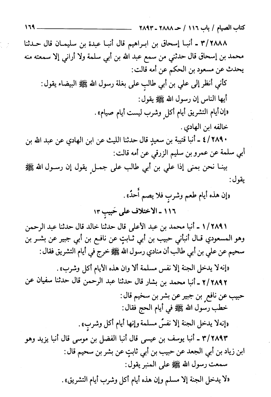 2888 - أنبأ إسحاق بن إبراهيم قال أنبأ عبدة بن سليمان قال حدثنا محمد بن إسحاق قال حدثني من سمع عبد الله بن أبي سلمة ولا أراني إلا سمعته منه يحدث عن مسعود بن الحكم عن أمه قالت : كأني أنظر إلى علي بن أبي طالب على بغلة رسول الله صلى الله عليه و سلم البيضاء يقول أيها الناس إن رسول الله صلى الله عليه و سلم يقول إن أيام التشريق أيام أكل وشرب ليست أيام صيام خالفه بن الهادي