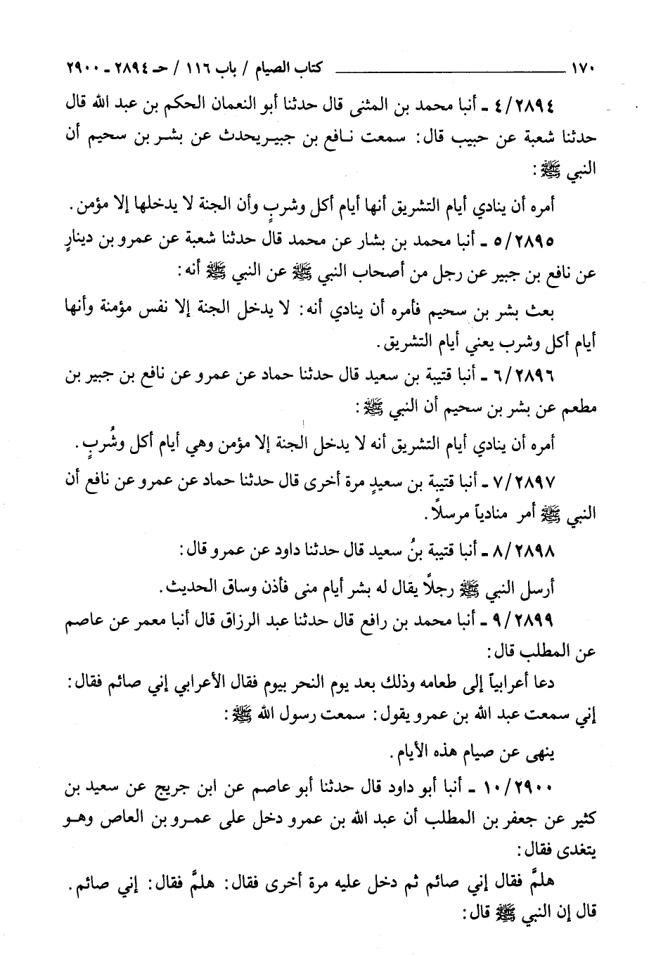 2900 - أنبأ أبو داود قال حدثنا أبو عاصم عن بن جريج عن سعيد بن كثير عن جعفر بن المطلب : أن عبد الله بن عمرو دخل على عمرو بن العاص وهو يتغدى فقال هلم فقال إني صائم ثم دخل عليه مرة أخرى فقال هلم فقال إني صائم قال إن النبي صلى الله عليه و سلم قال إنها أيام أكل وشرب يعني أيام التشريق