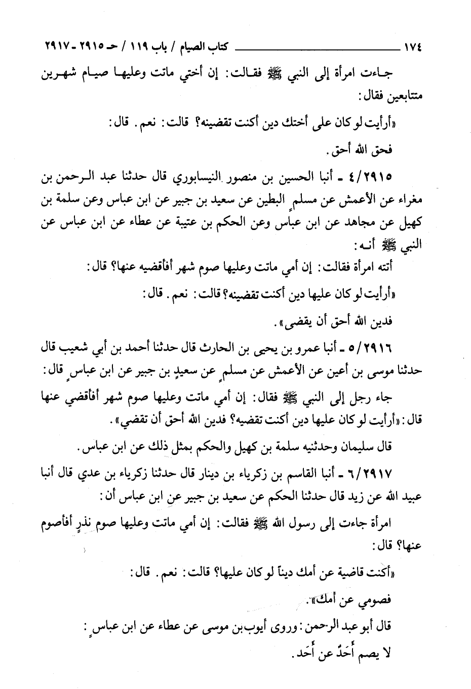 2915 - أنبأ الحسين بن منصور النيسابوري قال حدثنا عبد الرحمن بن مغراء عن الأعمش عن مسلم البطين عن سعيد بن جبير عن بن عباس وعن سلمة بن كهيل عن مجاهد عن بن عباس وعن الحكم بن عتيبة عن عطاء عن بن عباس عن النبي صلى الله عليه و سلم : أنه أتته امرأة فقالت إن أمي ماتت وعليها صوم شهر أفأقضيه عنها قال أرأيت لو كان عليها دين أكنت تقضينه قالت نعم قال فدين الله أحق أن يقضى