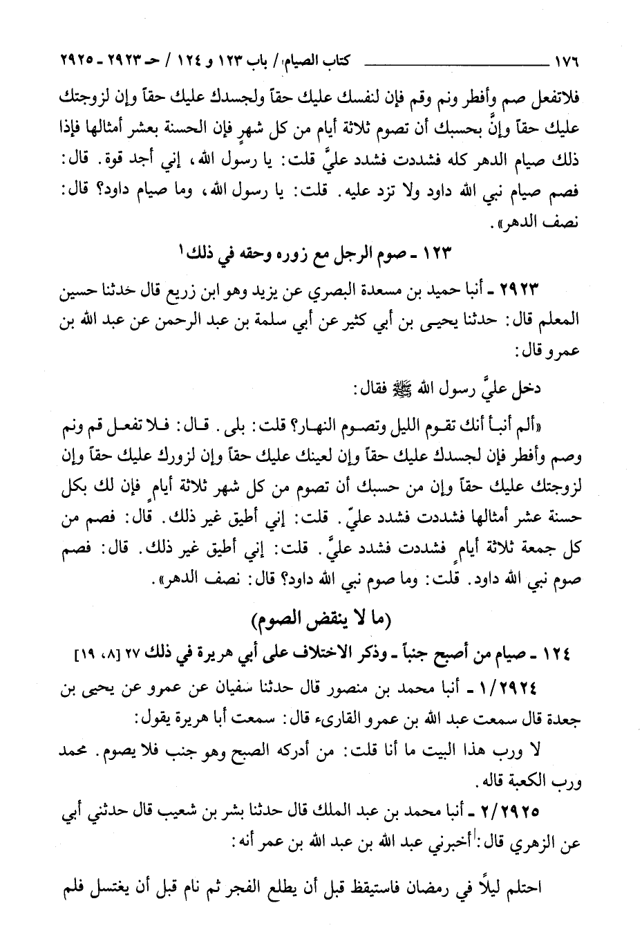 2923 - أنبأ حميد بن مسعدة البصري عن يزيد وهو بن زريع قال حدثنا حسين المعلم قال حدثنا يحيى بن أبي كثير عن أبي سلمة بن عبد الرحمن عن عبد الله بن عمرو قال دخل علي رسول الله صلى الله عليه و سلم فقال : ألم أنبأ أنك تقوم الليل وتصوم النهار قلت بلى قال فلا تفعل قم ونم وصم وأفطر فإن لجسدك عليك حقا وإن لعينك عليك حقا وإن لزورك عليك حقا وإن لزوجتك عليك حقا وإن من حسبك أن تصوم من كل شهر ثلاثة أيام فإن لك بكل حسنة عشر أمثالها فشددت فشدد علي قلت إني أطيق غير ذلك قال فصم من كل جمعة ثلاثة أيام فشددت فشدد علي قلت إني أطيق غير ذلك قال فصم صوم نبي الله داود قلت وما صوم نبي الله داود قال نصف الدهر ما لا ينقض الصوم