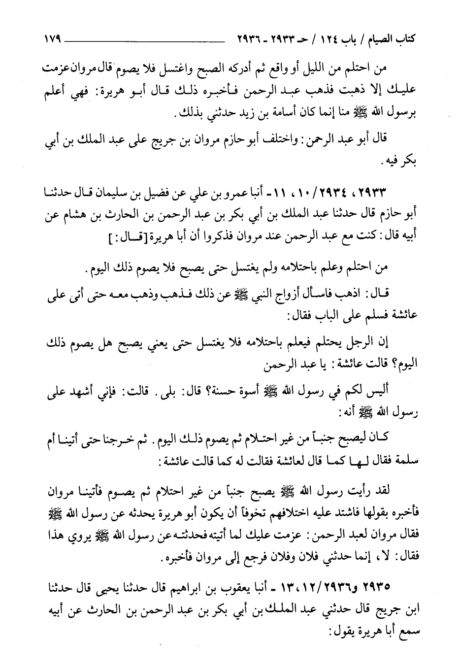 2933 - أنبأ عمرو بن علي عن فضيل بن سليمان قال حدثنا أبو حازم قال حدثنا عبد الملك بن أبي بكر بن عبد الرحمن بن الحارث بن هشام عن أبيه قال : كنت مع عبد الرحمن عند مروان فذكروا أن أبا هريرة قال من احتلم وعلم باحتلامه ولم يغتسل حتى يصبح فلا يصوم ذلك اليوم قال اذهب فاسأل أزواج النبي صلى الله عليه و سلم عن ذلك فذهب وذهب معه حتى أتى على عائشة فسلم على الباب فقال إن الرجل يحتلم فيعلم باحتلامه فلا يغتسل حتى يعني يصبح هل يصوم ذلك اليوم قالت عائشة يا عبد الرحمن أليس لكم في رسول الله صلى الله عليه و سلم أسوة حسنة قال بلى قالت فإني أشهد على رسول الله صلى الله عليه و سلم أنه كان ليصبح جنبا من غير احتلام ثم يصوم ذلك اليوم ثم خرجنا حتى أتينا أم سلمة فقال لها كما قال لعائشة فقالت له كما قالت عائشة لقد رأيت رسول الله صلى الله عليه و سلم يصبح جنبا من غير احتلام ثم يصوم فأتينا مروان فأخبره بقولها فاشتد عليه اختلافهم تخوفا أن يكون أبو هريرة يحدثه عن رسول الله صلى الله عليه و سلم فقال مروان لعبد الرحمن عزمت عليك لما أتيته فحدثته عن رسول الله صلى الله عليه و سلم يروي هذا فقال لا إنما حدثني فلان وفلان فرجع إلى مروان فأخبره