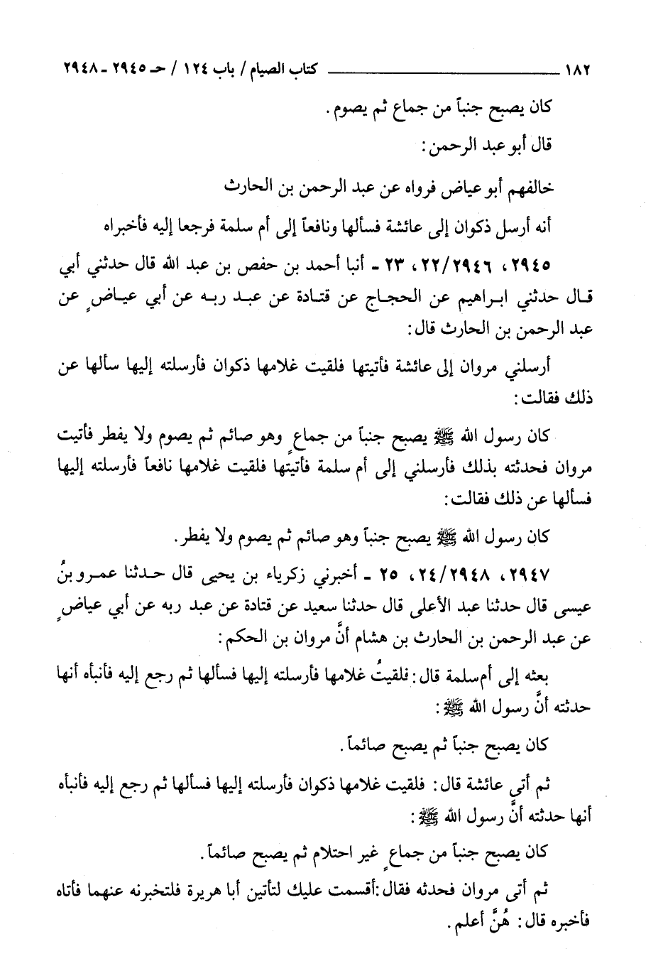 2947 - أخبرني زكريا بن يحيى قال حدثنا عمرو بن عيسى قال حدثنا عبد الأعلى قال حدثنا سعيد عن قتادة عن عبد ربه عن أبي عياض عن عبد الرحمن بن الحارث بن هشام أن مروان بن الحكم بعثه إلى أم سلمة قال فلقيت غلامها فأرسلته إليها فسألها ثم رجع إليه فأنبأه أنها حدثته : أن رسول الله صلى الله عليه و سلم كان يصبح جنبا ثم يصبح صائما ثم أتى عائشة قال فلقيت غلامها ذكوان فأرسلته إليها فسألها ثم رجع إليه فأنبأه أنها حدثته أن رسول الله صلى الله عليه و سلم كان يصبح جنبا من جماع غير احتلام ثم يصبح صائما ثم أتى مروان فحدثه فقال أقسمت عليك لتأتين أبا هريرة فلتخبرنه عنهما فأتاه فأخبره قال هن أعلم