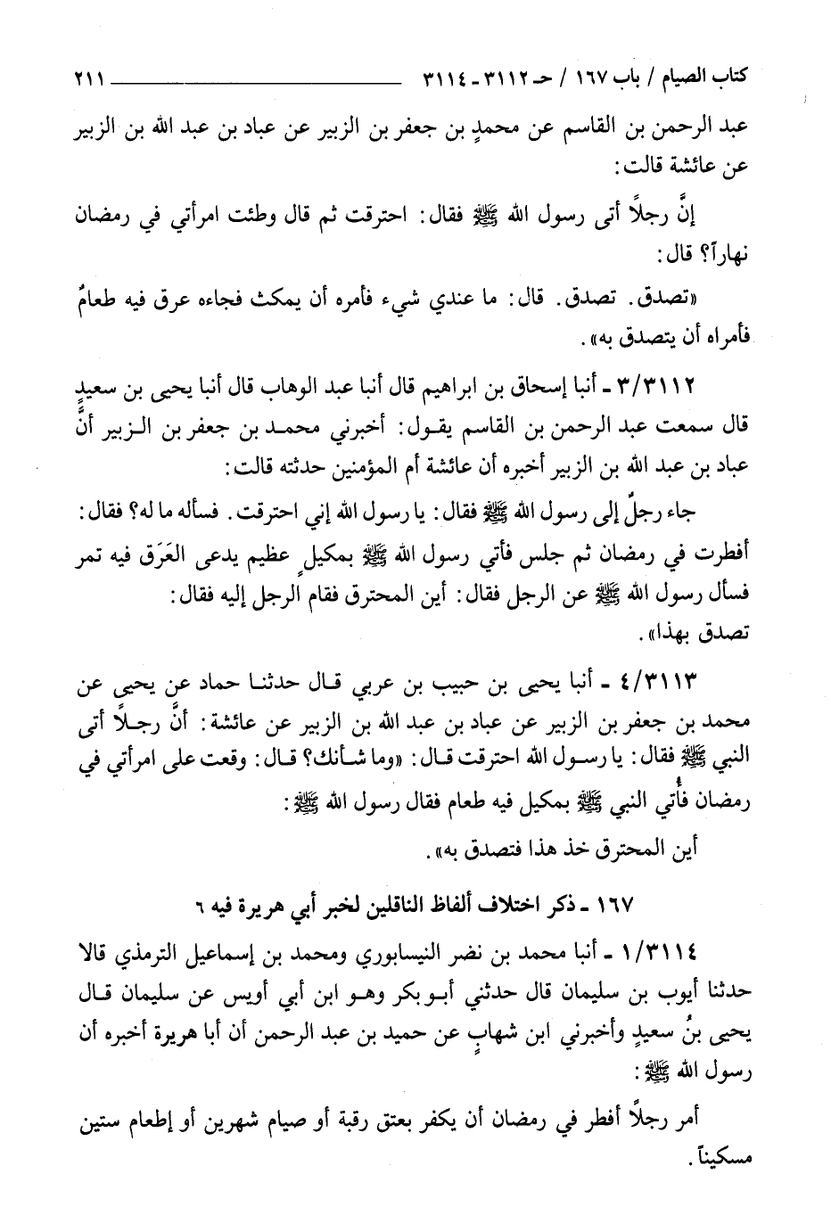 3112 - أنبأ إسحاق بن إبراهيم قال أنبأ عبد الوهاب قال أنبأ يحيى بن سعيد قال سمعت عبد الرحمن بن القاسم يقول أخبرني محمد بن جعفر بن الزبير أن عباد بن عبد الله بن الزبير أخبره أن عائشة أم المؤمنين حدثته قالت جاء رجل إلى رسول الله صلى الله عليه و سلم فقال : يا رسول الله إني احترقت فسأله ما له فقال أفطرت في رمضان ثم جلس فأتي رسول الله صلى الله عليه و سلم بمكيل عظيم يدعى العرق فيه تمر فسأل رسول الله صلى الله عليه و سلم عن الرجل فقال أين المحترق فقام الرجل إليه فقال تصدق بهذا