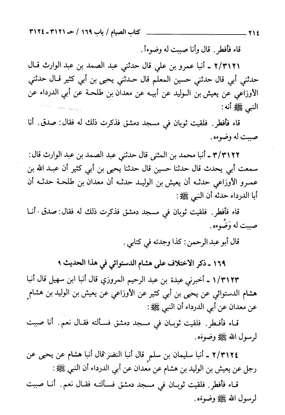 3121 - أنبأ عمرو بن علي قال حدثني عبد الصمد بن عبد الوارث قال حدثني أبي قال حدثني حسين المعلم قال حدثني يحيى بن أبي كثير قال حدثني الأوزاعي عن يعيش بن الوليد عن أبيه عن معدان بن طلحة عن أبي الدرداء عن النبي صلى الله عليه و سلم : انه قاء فأفطر فلقيت ثوبان في مسجد دمشق فذكرت ذلك له فقال صدق أنا صببت له وضوءه