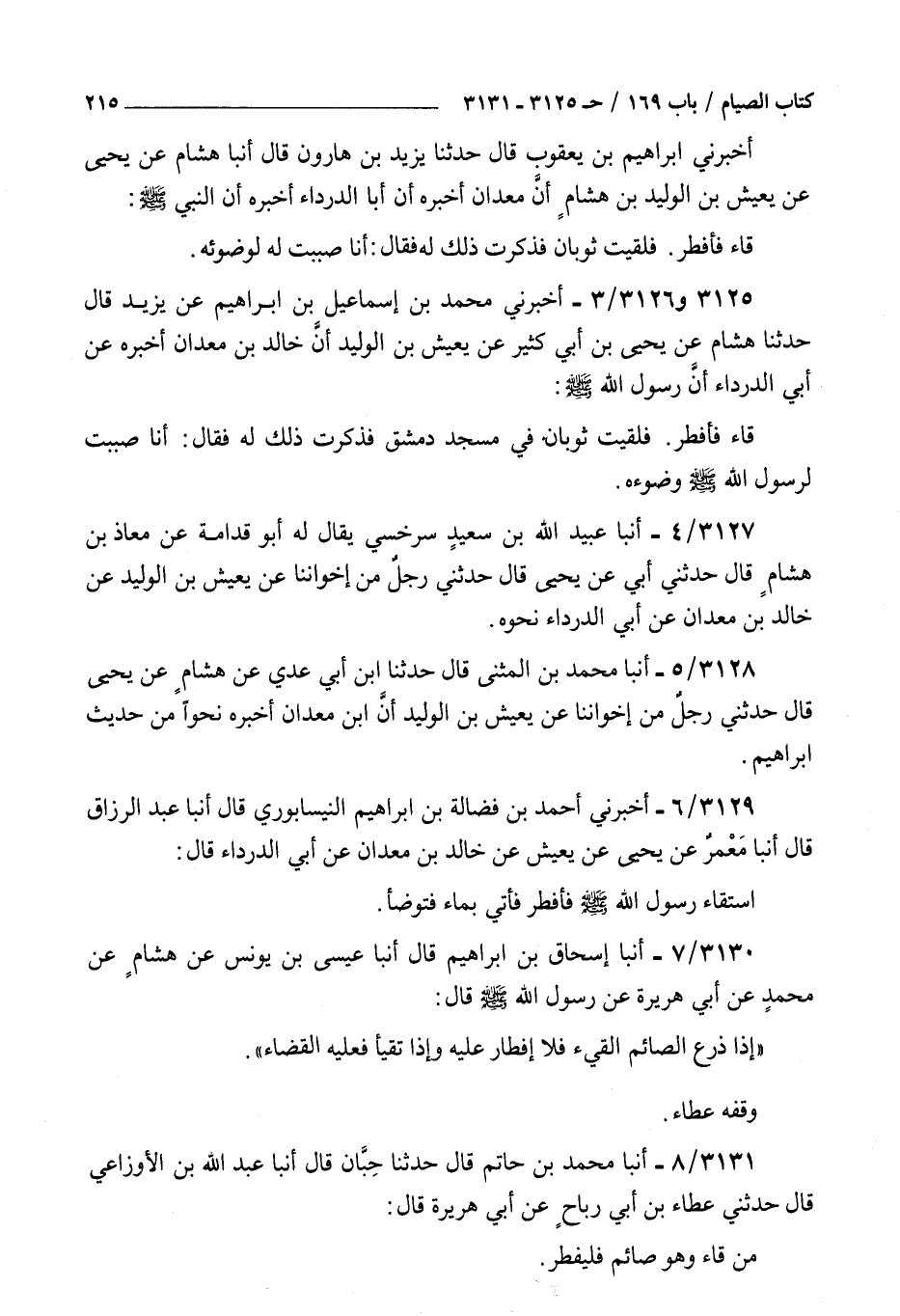 3126 - أخبرني محمد بن إسماعيل بن إبراهيم عن يزيد قال حدثنا هشام عن يحيى بن أبي كثير عن يعيش بن الوليد أن خالد بن معدان أخبره عن أبي الدرداء : أن رسول الله صلى الله عليه و سلم قاء فأفطر فلقيت ثوبان في مسجد دمشق فذكرت ذلك له فقال أنا صببت لرسول الله صلى الله عليه و سلم وضوءه