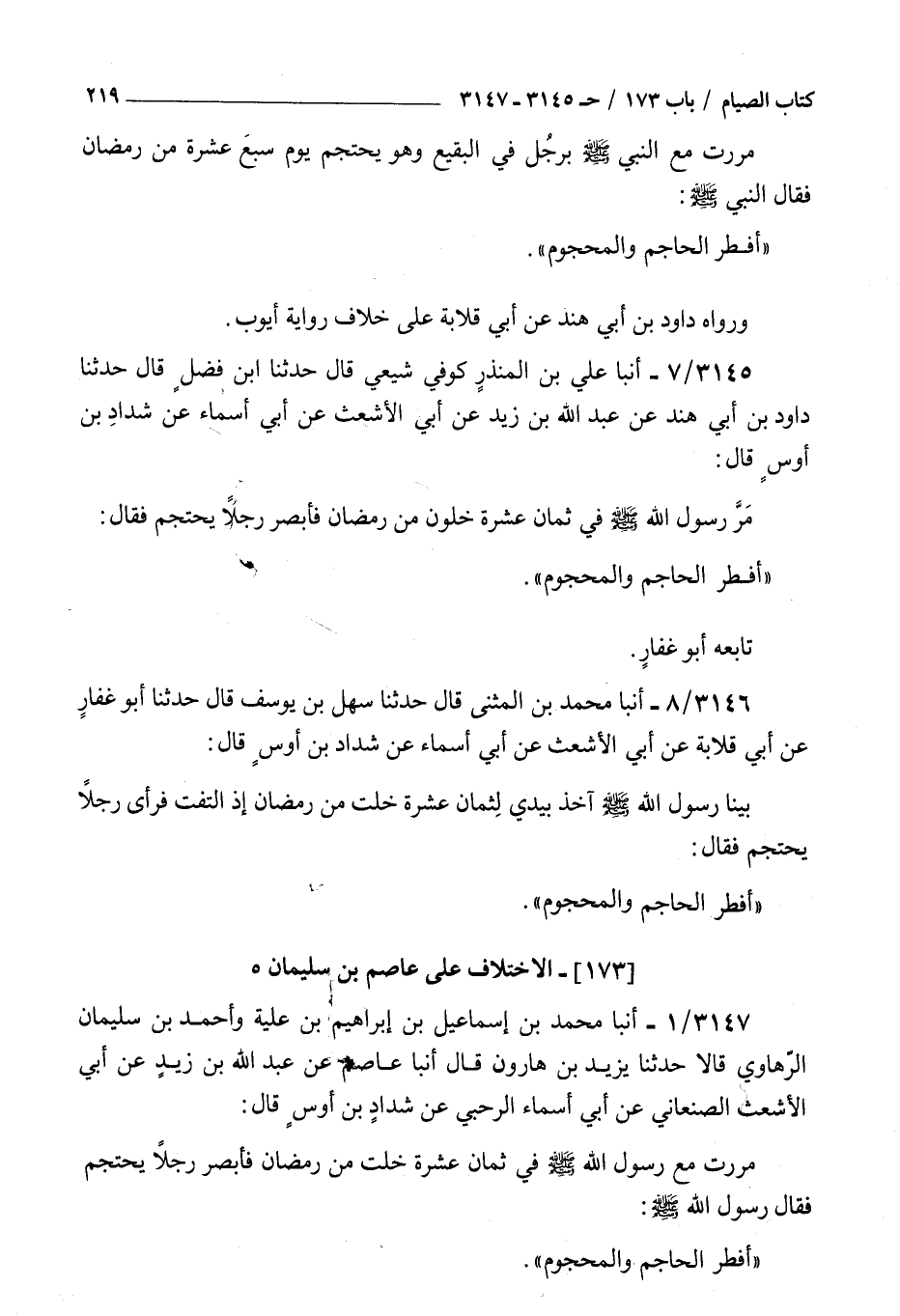 3147 - أنبأ محمد بن إسماعيل بن إبراهيم بن علية وأحمد بن سليمان الرهاوي قالا حدثنا يزيد بن هارون قال أنبأ عاصم عن عبد الله بن زيد عن أبي الأشعث الصنعاني عن أبي أسماء الرحبي عن شداد بن أوس قال : مررت مع رسول الله صلى الله عليه و سلم في ثمان عشرة خلت من رمضان فأبصر رجلا يحتجم فقال رسول الله صلى الله عليه و سلم أفطر الحاجم والمحجوم تابعه زائدة