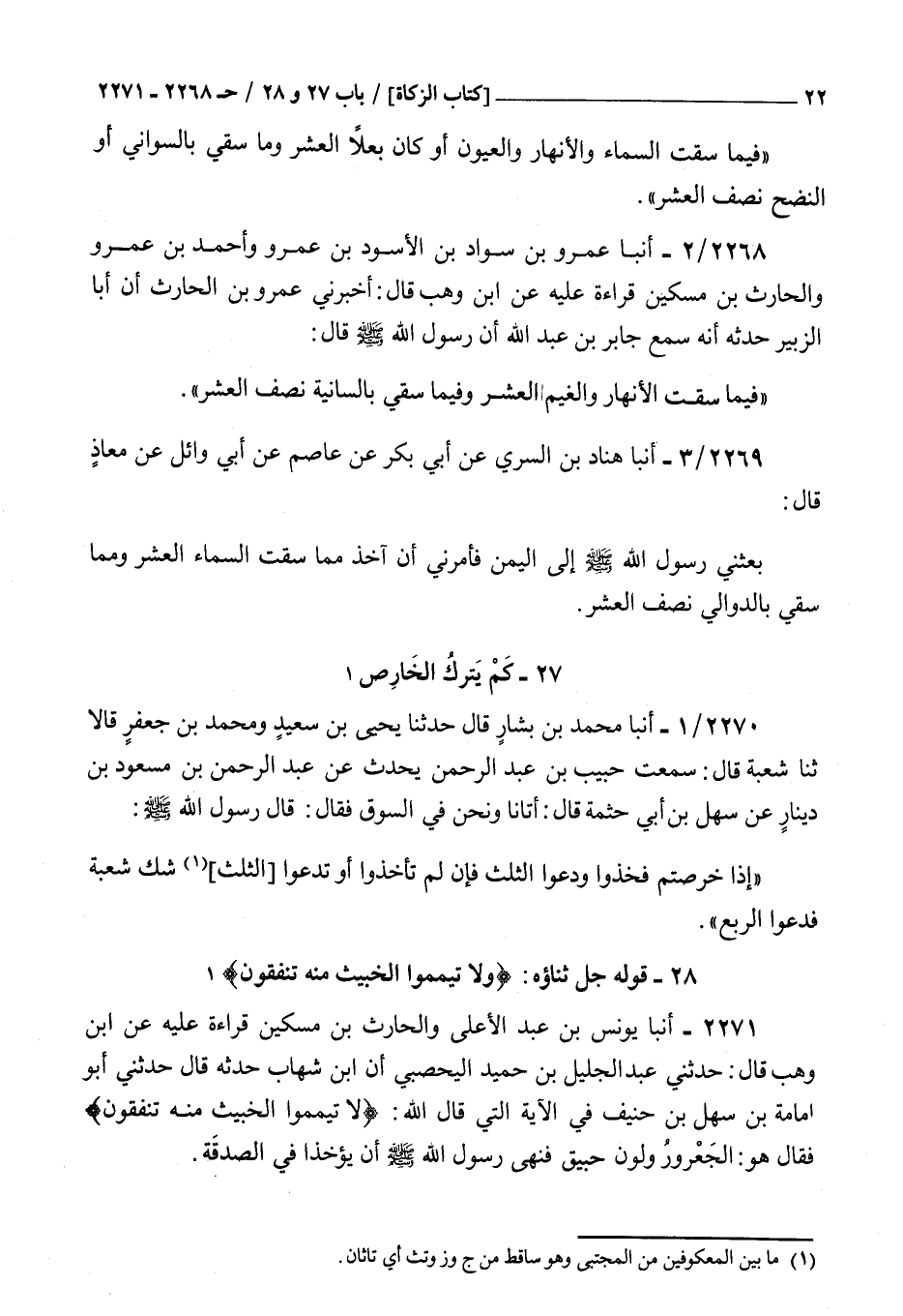 2270 - أنبأ محمد بن بشار قال حدثنا يحيى بن سعيد ومحمد بن جعفر قالا ثنا شعبة قال سمعت حبيب بن عبد الرحمن يحدث عن عبد الرحمن بن مسعود بن دينار عن سهل بن أبي حثمة قال أتانا ونحن في السوق فقال قال رسول الله صلى الله عليه و سلم : إذا خرصتم فخذوا ودعوا الثلث فإن لم تأخذوا أو تدعوا الثلث شك شعبة فدعوا الربع