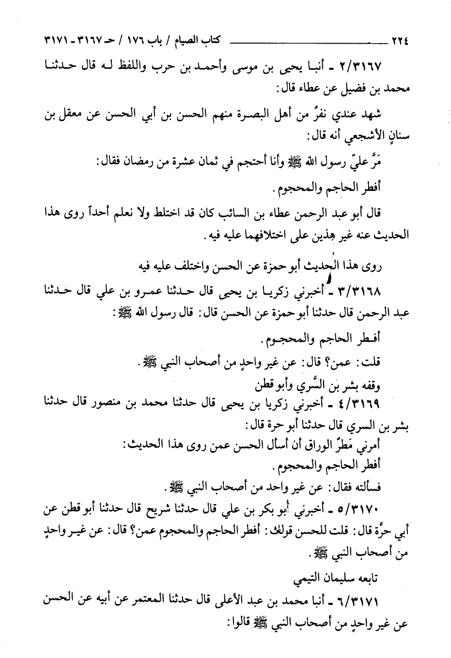 3169 - أخبرني زكريا بن يحيى قال حدثنا محمد بن منصور قال حدثنا بشر بن السري قال حدثنا أبو حرة قال : أمرني مطر الوراق أن أسأل الحسن عمن روى هذا الحديث أفطر الحاجم والمحجوم فسألته فقال عن غير واحد من أصحاب النبي صلى الله عليه و سلم