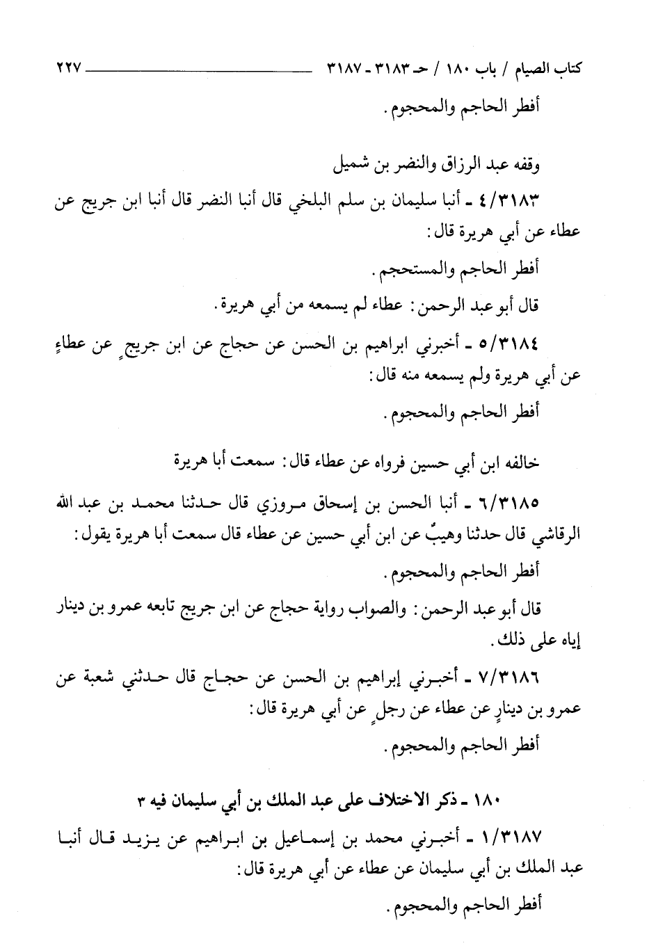3183 - أنبأ سليمان بن سلم البلخي قال أنبأ النضر قال أنبأ بن جريج عن عطاء عن أبي هريرة قال : أفطر الحاجم والمستحجم قال أبو عبد الرحمن عطاء لم يسمعه من أبي هريرة