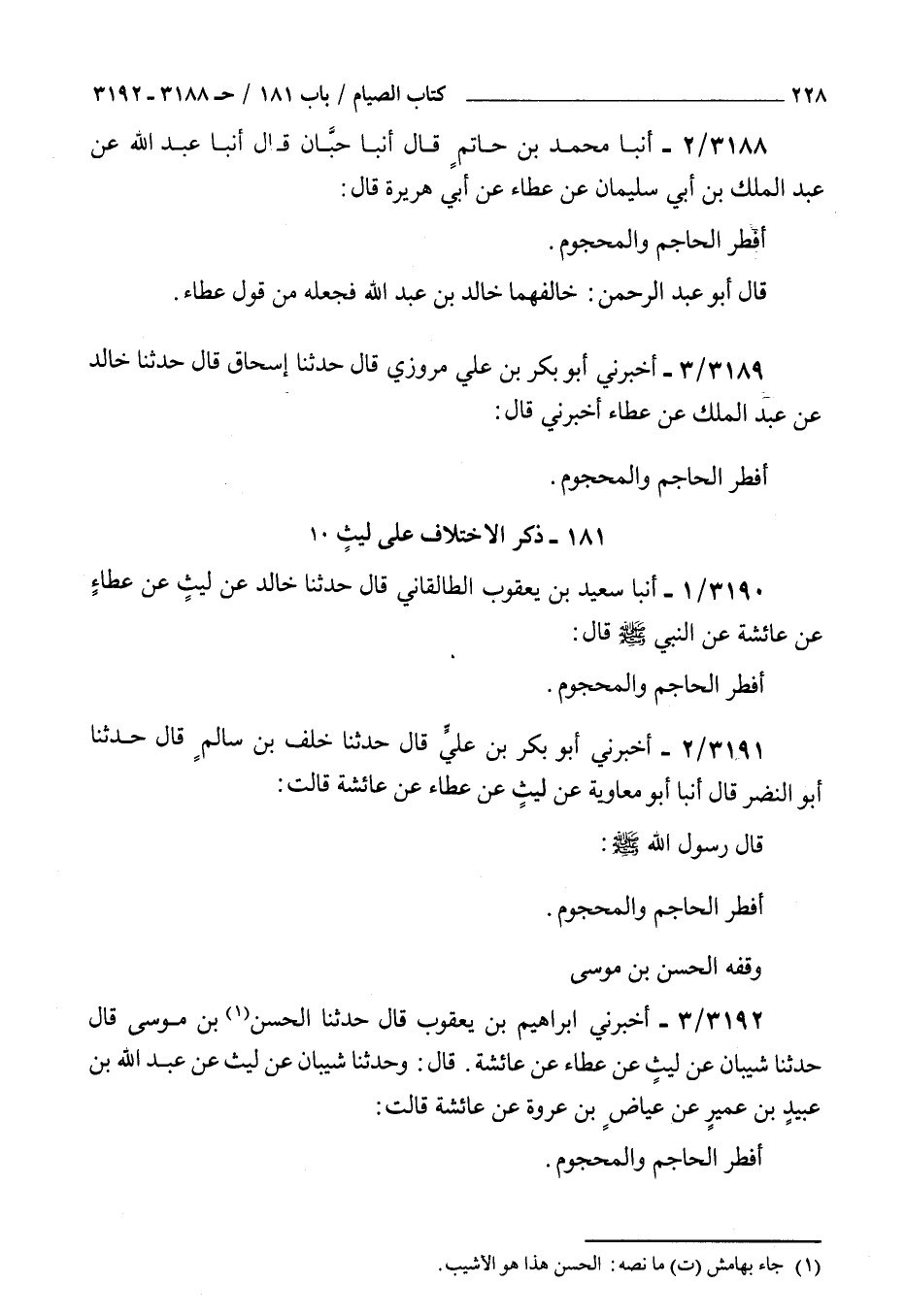 3188 - أنبأ محمد بن حاتم قال أنبأ حبان قال أنبأ عبد الله عن عبد الملك بن أبي سليمان عن عطاء عن أبي هريرة قال : أفطر الحاجم والمحجوم قال أبو عبد الرحمن خالفهما خالد بن عبد الله فجعله من قول عطاء