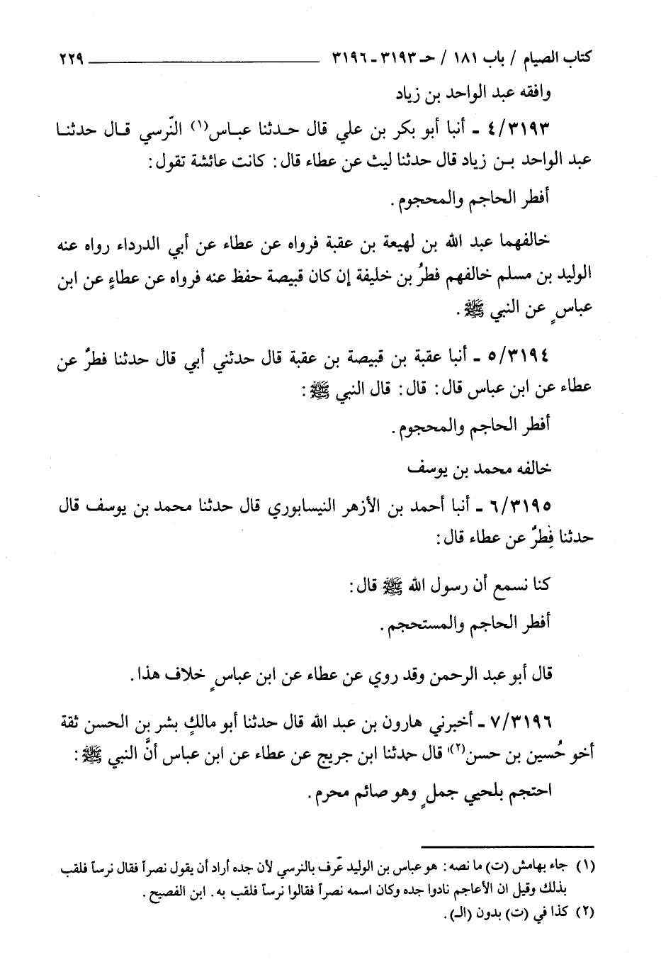 3193 - أنبأ أبو بكر بن علي قال حدثنا عباس النرسي قال حدثنا عبد الواحد بن زياد قال حدثنا ليث عن عطاء قال : كانت عائشة تقول أفطر الحاجم والمحجوم خالفهما عبد الله بن لهيعة بن عقبة فرواه عن عطاء عن أبي الدرداء رواه عنه الوليد بن مسلم خالفهم فطر بن خليفة إن كان قبيصة حفظ عنه فرواه عن عطاء عن بن عباس عن النبي صلى الله عليه و سلم