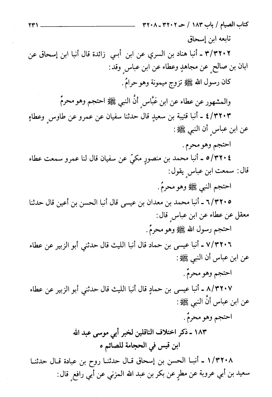 3206 - أنبأ عيسى بن حماد قال أنبأ الليث قال حدثني أبو الزبير عن عطاء عن بن عباس : أن النبي صلى الله عليه و سلم احتجم وهو محرم