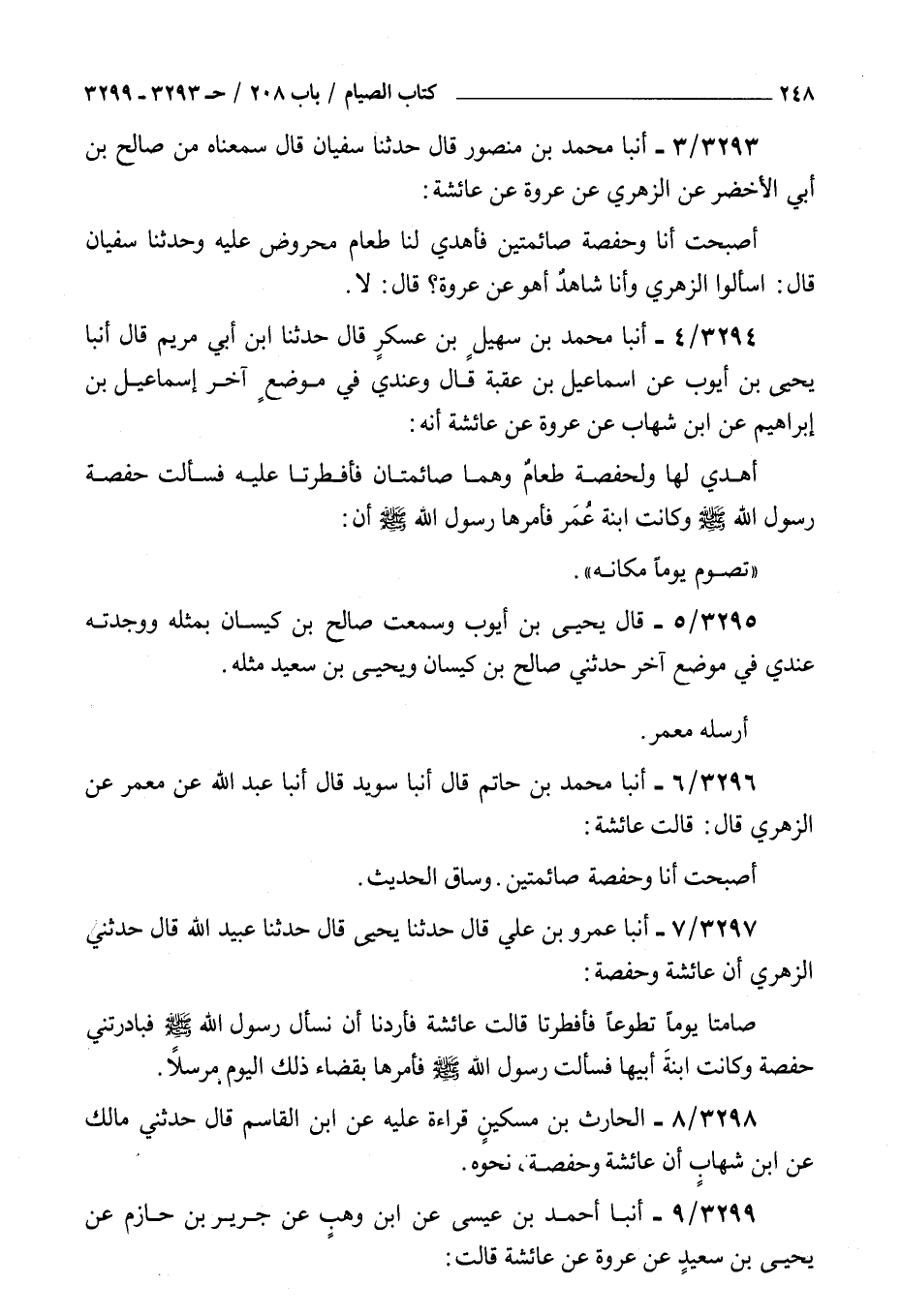 3293 - أنبأ محمد بن منصور قال حدثنا سفيان قال سمعناه من صالح بن أبي الأخضر عن الزهري عن عروة عن عائشة : أصبحت أنا وحفصة صائمتين فأهدي لنا طعام محروص عليه وحدثنا سفيان قال اسألوا الزهري وأنا شاهد أهو عن عروة قال لا