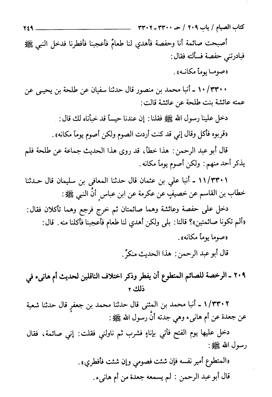 3300 - أنبأ محمد بن منصور قال حدثنا سفيان عن طلحة بن يحيى عن عمته عائشة بنت طلحة عن عائشة قالت : دخل علينا رسول الله صلى الله عليه و سلم فقلنا إن عندنا حيسا قد خبأناه لك قال قربوه فأكل وقال إني قد كنت أردت الصوم ولكن أصوم يوما مكانه قال أبو عبد الرحمن هذا خطأ قد روى هذا الحديث جماعة عن طلحة فلم يذكر أحد منهم ولكن أصوم يوما مكانه