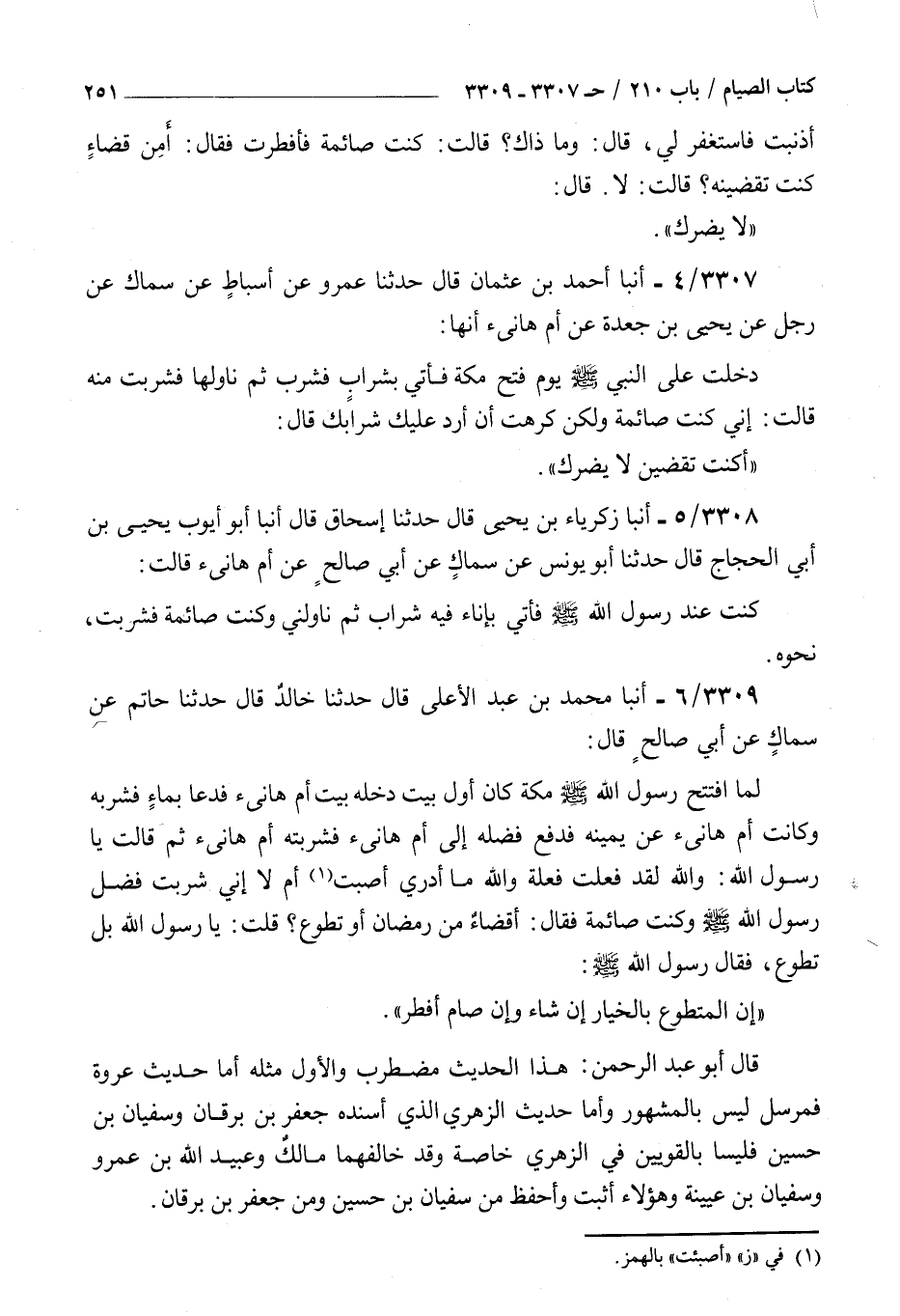 3308 - أنبأ زكريا بن يحيى قال حدثنا إسحاق قال أنبأ أبو أيوب يحيى بن أبي الحجاج قال حدثنا أبو يونس عن سماك عن أبي صالح عن أم هانئ قالت : كنت عند رسول الله صلى الله عليه و سلم فأتي بإناء فيه شراب ثم ناولني وكنت صائمة فشربت نحوه