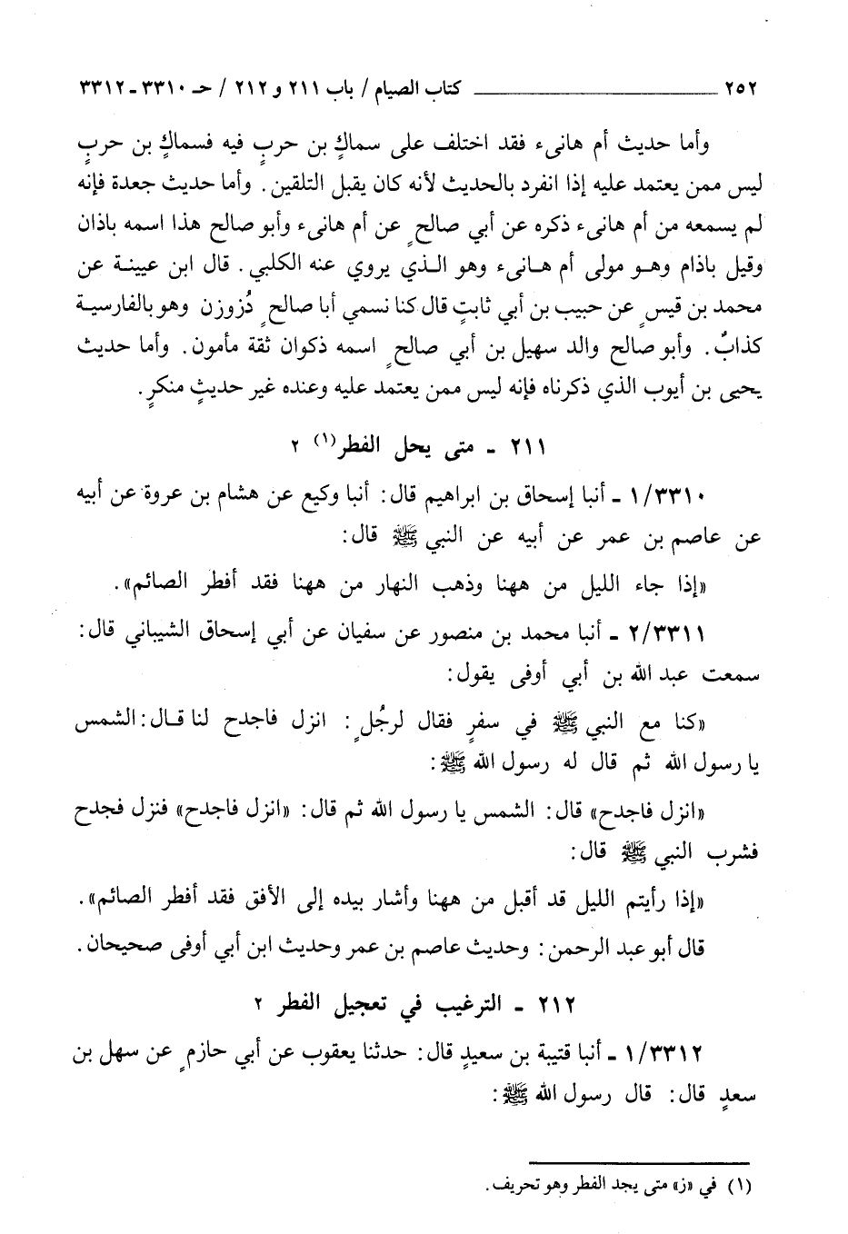 3311 - أنبأ محمد بن منصور عن سفيان عن أبي إسحاق الشيباني قال سمعت عبد الله بن أبي أوفى يقول : كنا مع النبي صلى الله عليه و سلم في سفر فقال لرجل انزل فاجدح لنا قال الشمس يا رسول الله ثم قال له رسول الله صلى الله عليه و سلم انزل فاجدح قال الشمس يا رسول الله ثم قال انزل فاجدح فنزل فجدح فشرب النبي صلى الله عليه و سلم قال إذا رأيتم الليل قد أقبل من ههنا وأشار بيده إلى الأفق فقد أفطر الصائم قال أبو عبد الرحمن وحديث عاصم بن عمر وحديث بن أبي أوفى صحيحان