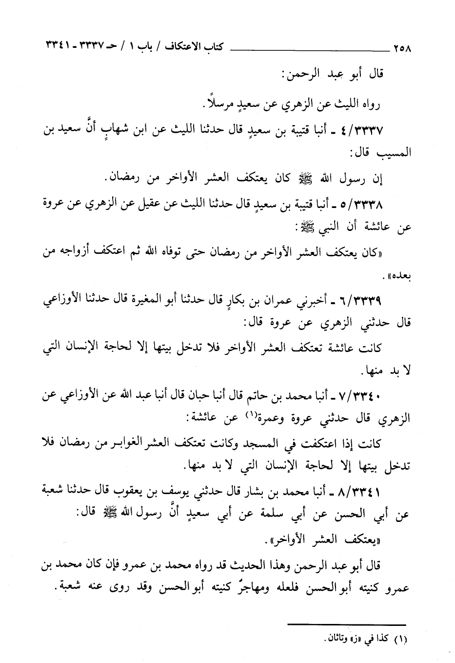 3339 - أخبرني عمران بن بكار قال حدثنا أبو المغيرة قال حدثنا الأوزاعي قال حدثني الزهري عن عروة قال : كانت عائشة تعتكف العشر الأواخر فلا تدخل بيتها إلا لحاجة الإنسان التي لا بد منها