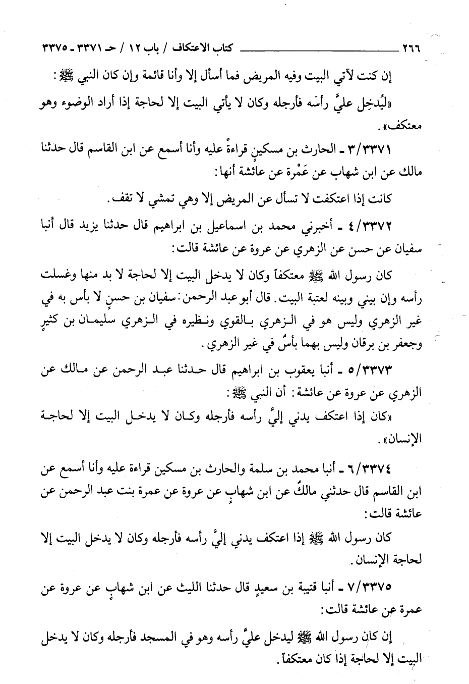 3375 - أنبأ قتيبة بن سعيد قال حدثنا الليث عن بن شهاب عن عروة عن عمرة عن عائشة قالت : إن كان رسول الله صلى الله عليه و سلم ليدخل علي رأسه وهو في المسجد فأرجله وكان لا يدخل البيت إلا لحاجة إذا كان معتكفا