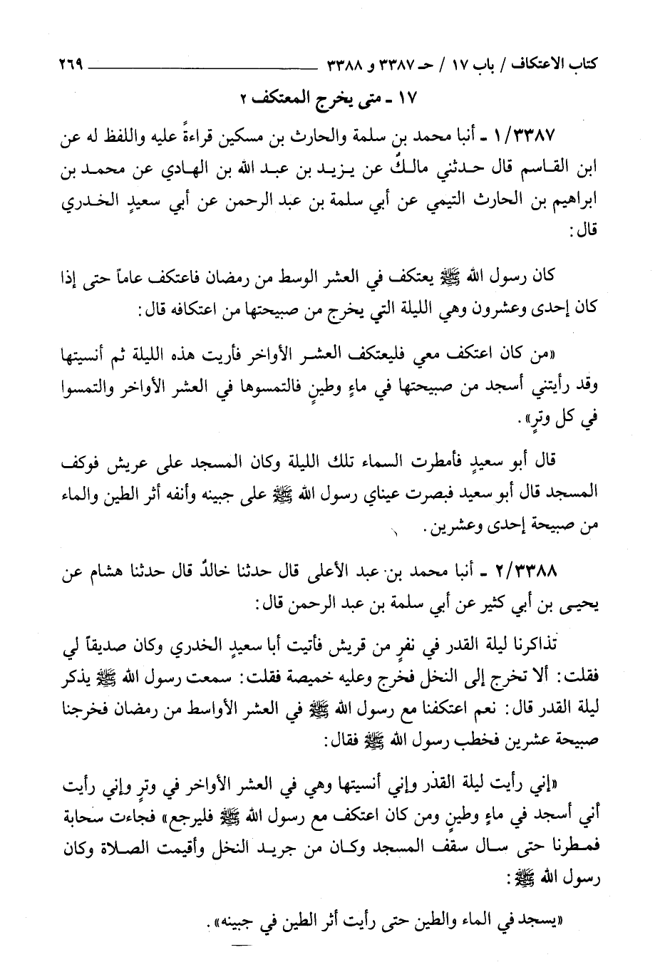 3387 - أنبأ محمد بن سلمة والحارث بن مسكين قراءة عليه واللفظ له عن بن القاسم قال حدثني مالك عن يزيد بن عبد الله بن الهادي عن محمد بن إبراهيم بن الحارث التيمي عن أبي سلمة بن عبد الرحمن عن أبي سعيد الخدري قال : كان رسول الله صلى الله عليه و سلم يعتكف في العشر الوسط من رمضان فاعتكف عاما حتى إذا كان إحدى وعشرون وهي الليلة التي يخرج من صبيحتها من اعتكافه قال من كان اعتكف معي فليعتكف العشر الأواخر فأريت هذه الليلة ثم أنسيتها وقد رأيتني أسجد من صبيحتها في ماء وطين فالتمسوها في العشر الأواخر والتمسوا في كل وتر قال أبو سعيد فأمطرت السماء تلك الليلة وكان المسجد على عريش فوكف المسجد قال أبو سعيد فبصرت عيناي رسول الله صلى الله عليه و سلم على جبينه وأنفه أثر الطين والماء من صبيحة إحدى وعشرين