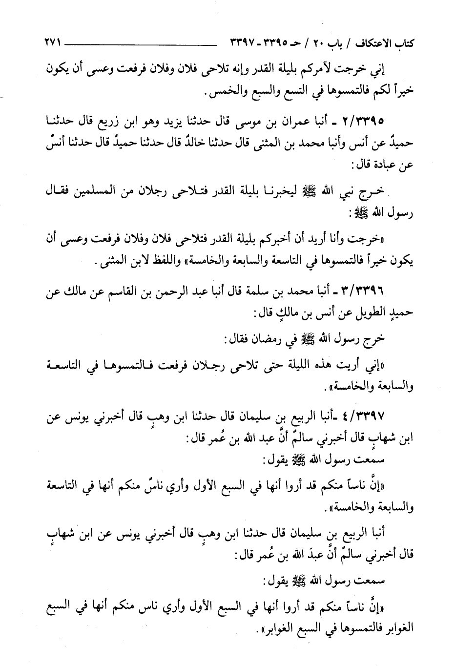 3397 - أنبأ الربيع بن سليمان قال حدثنا بن وهب قال أخبرني يونس عن بن شهاب قال أخبرني سالم أن عبد الله بن عمر قال سمعت رسول الله صلى الله عليه و سلم يقول : إن ناسا منكم قد أروا أنها في السبع الأول وأري ناس منكم أنها في التاسعة والسابعة والخامسة أنبأ الربيع بن سليمان قال حدثنا بن وهب قال أخبرني يونس عن بن شهاب قال أخبرني سالم أن عبد الله بن عمر قال سمعت رسول الله صلى الله عليه و سلم يقول إن ناسا منكم قد أروا أنها في السبع الأول وأري ناس منكم أنها في السبع الغوابر فالتمسوها في السبع الغوابر