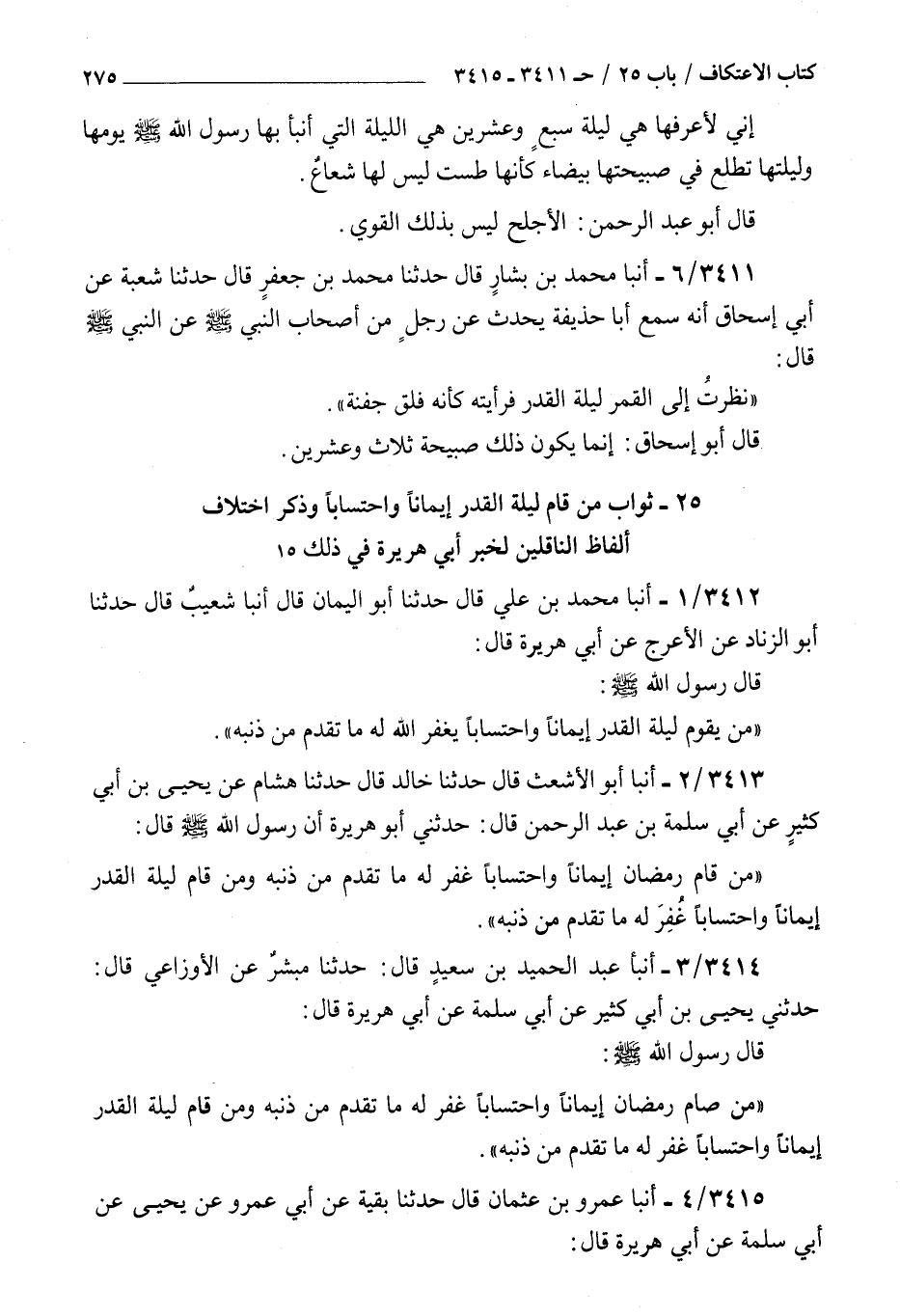 3412 - أنبأ محمد بن علي قال حدثنا أبو اليمان قال أنبأ شعيب قال حدثنا أبو الزناد عن الأعرج عن أبي هريرة قال قال رسول الله صلى الله عليه و سلم : من يقوم ليلة القدر إيمانا واحتسابا يغفر له ما تقدم من ذنبه